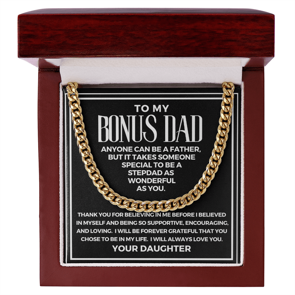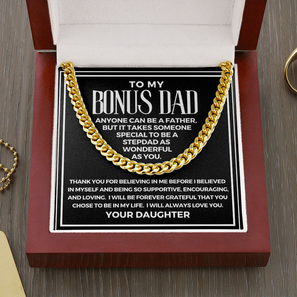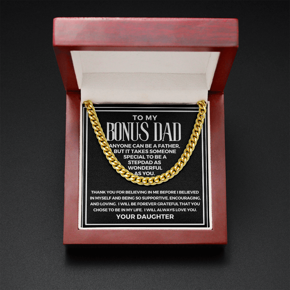 Surprise your bonus dad with a timeless and stylish Cuban Link Chain necklace that he can wear with almost anything - a perfect gift for any occasion! Our Cuban link necklace is available in polished stainless steel and in a 14k over stainless steel finish. The yellow gold Cuban link necklace chain measures 18 inches and fastens with a parrot clasp to keep it secure. This beautiful necklace is also one of the best unique birthday gift ideas because it comes in a luxury wooden gift box that features a LED light with a sweet, heartfelt message that will surely make your bonus dad feel loved and appreciated!
