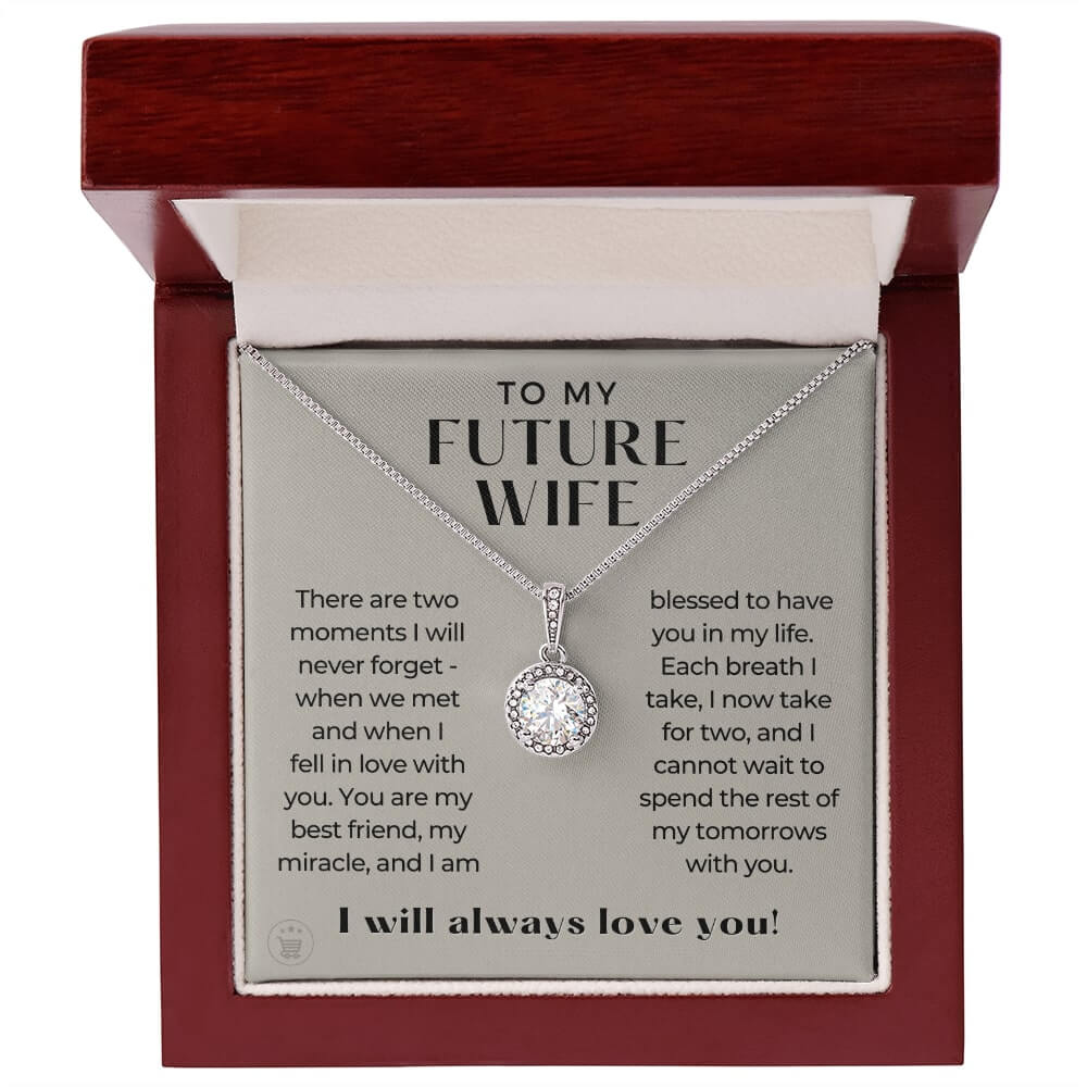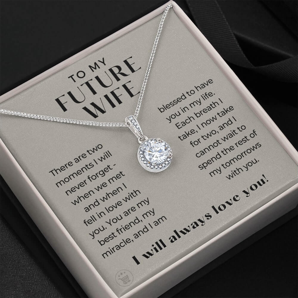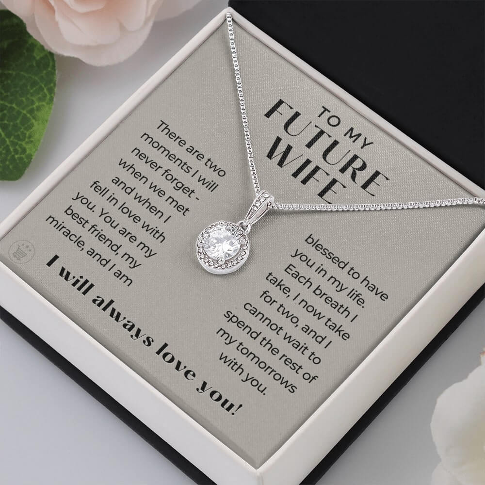 If you’re looking for a unique and special gift to give your future wife on a special occasion, then look no further! This beautiful necklace is crafted with love and thoughtfulness. The pendant necklace comes in an elegant gift box with a sweet message that will surely make your future wife feel loved and appreciated!