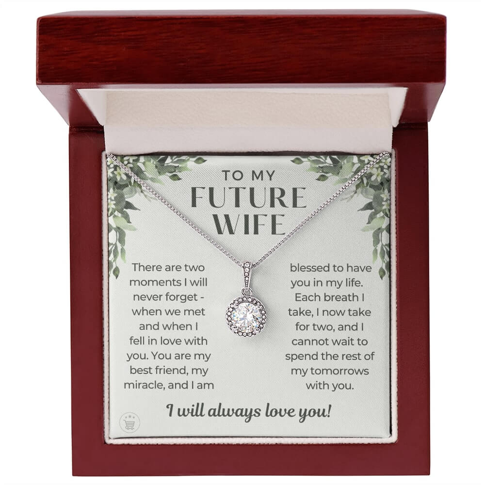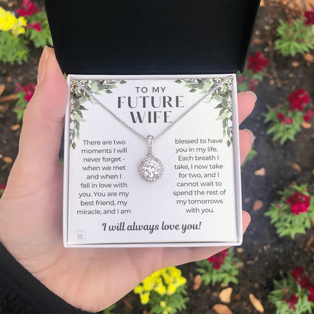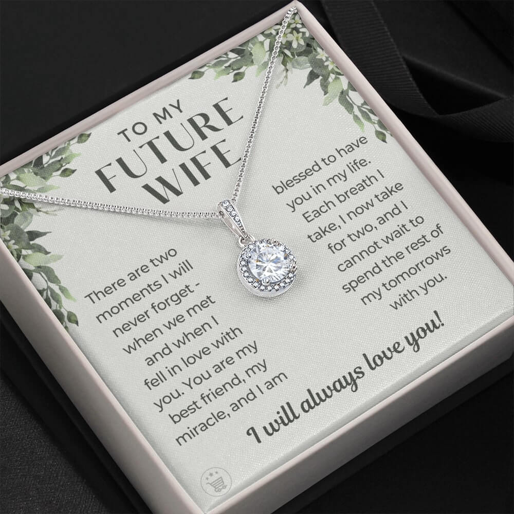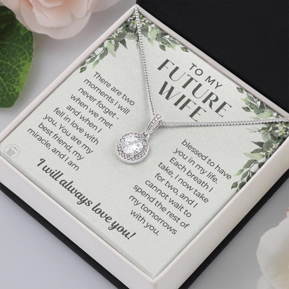 If you’re looking for a unique and special gift to give your future wife on a special occasion, then look no further! This beautiful necklace is crafted with love and thoughtfulness. The pendant necklace comes in an elegant gift box with a sweet message that will surely make your future wife feel loved and appreciated!