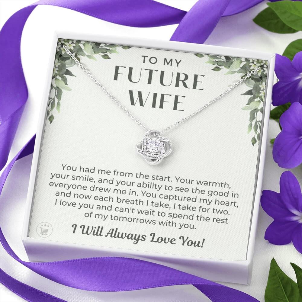 If you’re looking for a unique and special gift to give your future wife on a special occasion, then look no further! This beautiful necklace is crafted with love and thoughtfulness. The pendant necklace comes in an elegant gift box with a sweet message that will surely make your future wife feel loved and appreciated!
