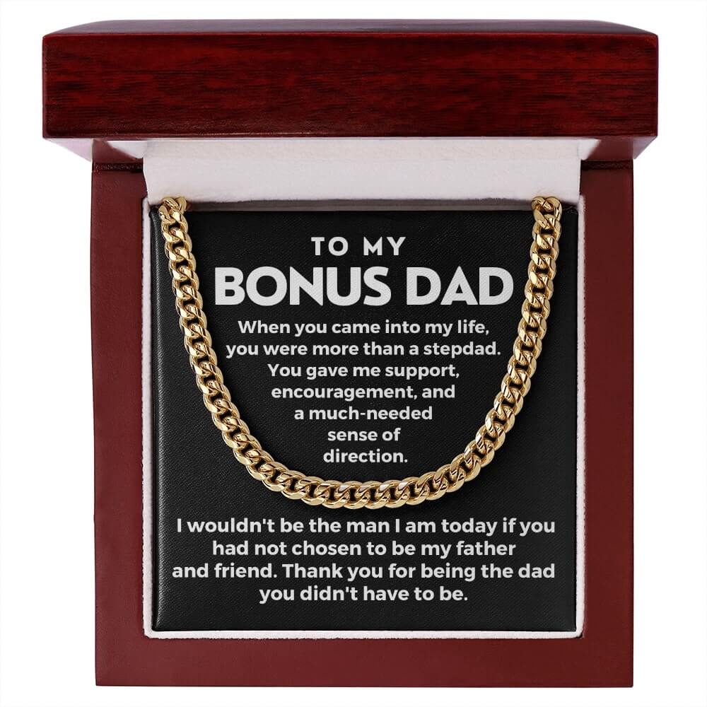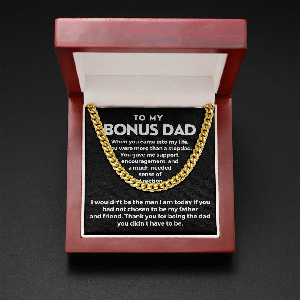 Surprise your bonus dad with a timeless and stylish Cuban Link Chain necklace that he can wear with almost anything - a perfect gift for any occasion! Our Cuban link necklace is available in polished stainless steel and in a 14k over stainless steel finish. The yellow gold Cuban link necklace chain measures 18 inches and fastens with a parrot clasp to keep it secure. This beautiful necklace is also one of the best unique birthday gift ideas because it comes in a luxury wooden gift box that features a LED light with a sweet, heartfelt message that will surely make your bonus dad feel loved and appreciated!