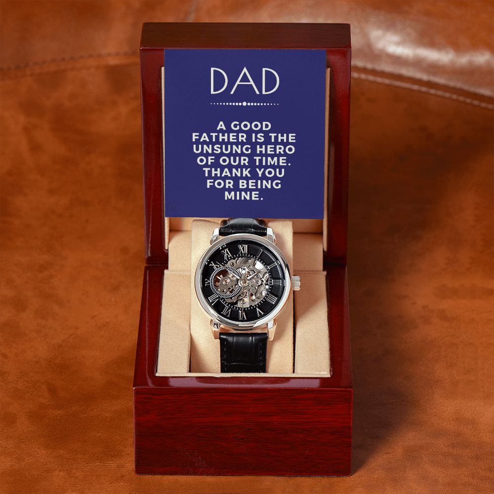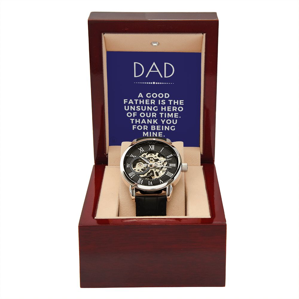 Surprise your dad with a classic design mens watch - a perfect gift for your dad! Our watch has a genuine leather strap and is splash-resistant and automatic making it durable yet stylish. This beautiful watch’s band length is approximately 7.9 inches and can be adjusted to 6.6" - 8.5". This beautiful watch is also one of the best unique birthday gift ideas because it comes in a luxury wooden watch box that features a LED light with a sweet, heartfelt message that will surely make your dad feel loved and appreciated!