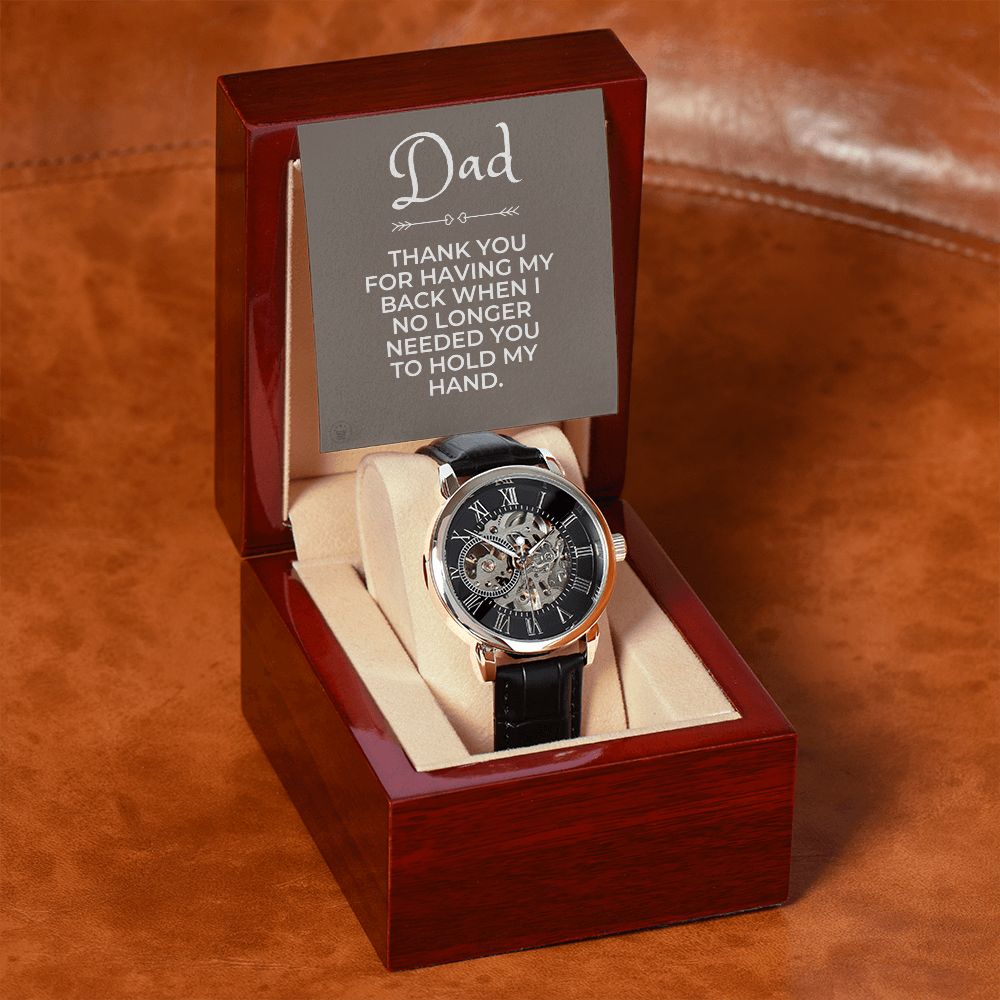 Surprise your dad with a classic design mens watch - a perfect gift for your dad! Our watch has a genuine leather strap and is splash-resistant and automatic making it durable yet stylish. This beautiful watch’s band length is approximately 7.9 inches and can be adjusted to 6.6" - 8.5". This beautiful watch is also one of the best unique birthday gift ideas because it comes in a luxury wooden watch box that features a LED light with a sweet, heartfelt message that will surely make your dad feel loved and appreciated!