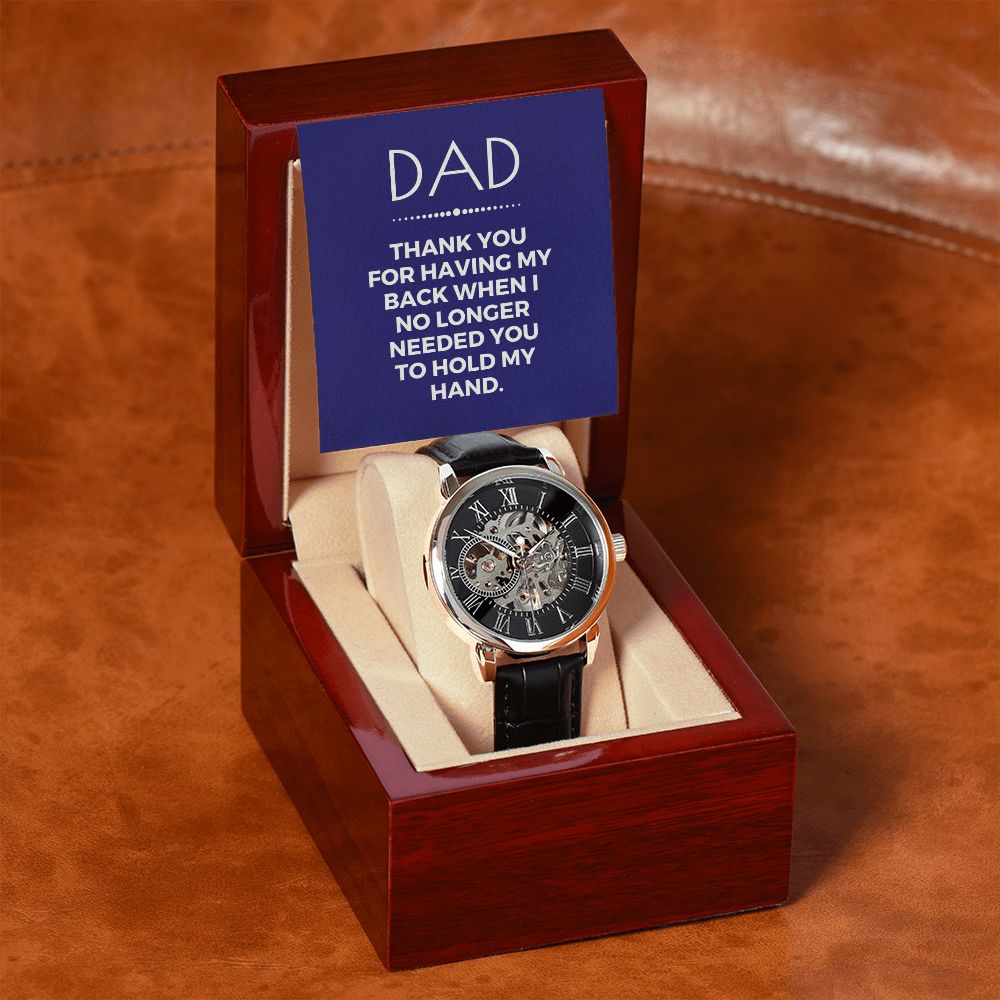 Surprise your dad with a classic design mens watch - a perfect gift for your dad! Our watch has a genuine leather strap and is splash-resistant and automatic making it durable yet stylish. This beautiful watch’s band length is approximately 7.9 inches and can be adjusted to 6.6" - 8.5". This beautiful watch is also one of the best unique birthday gift ideas because it comes in a luxury wooden watch box that features a LED light with a sweet, heartfelt message that will surely make your dad feel loved and appreciated!