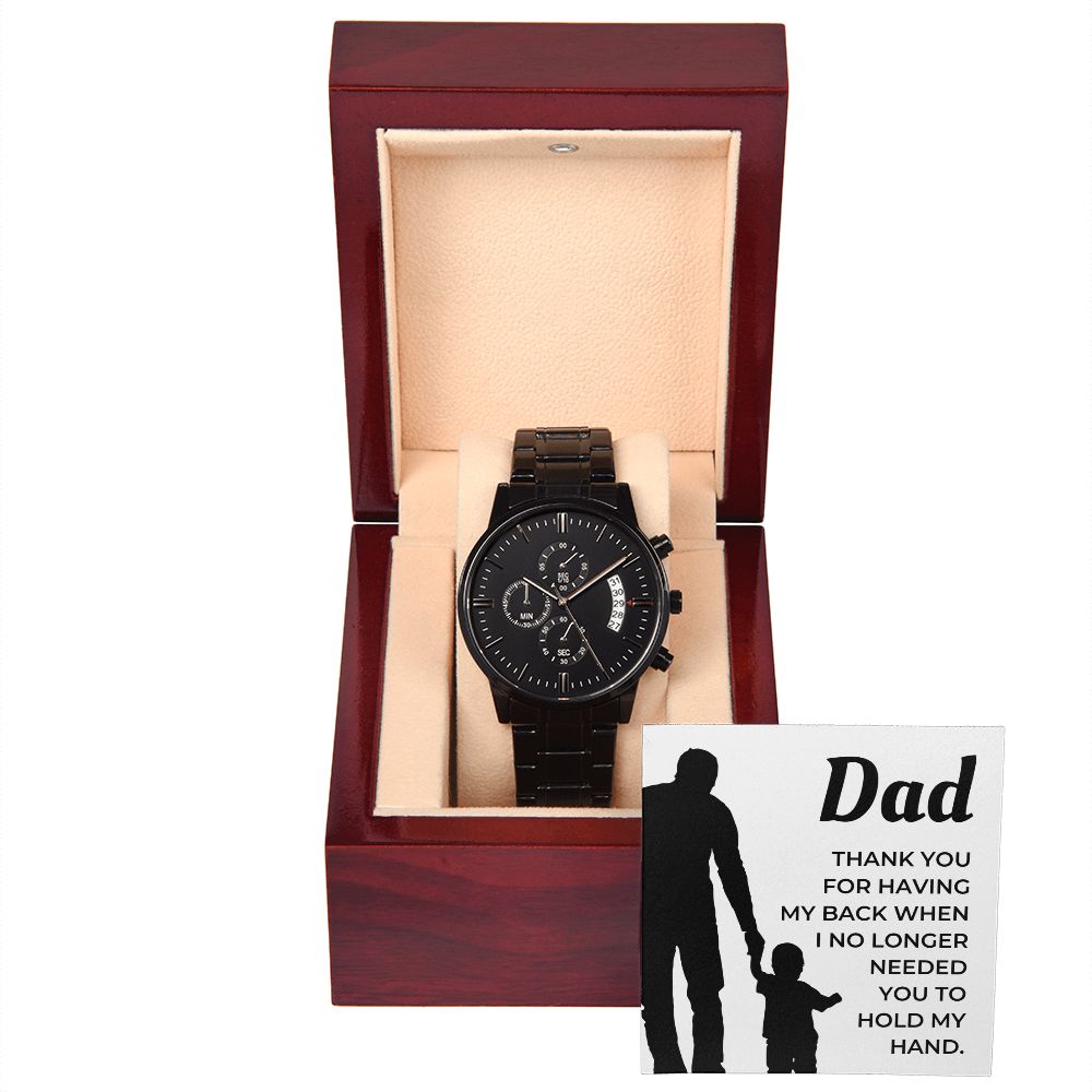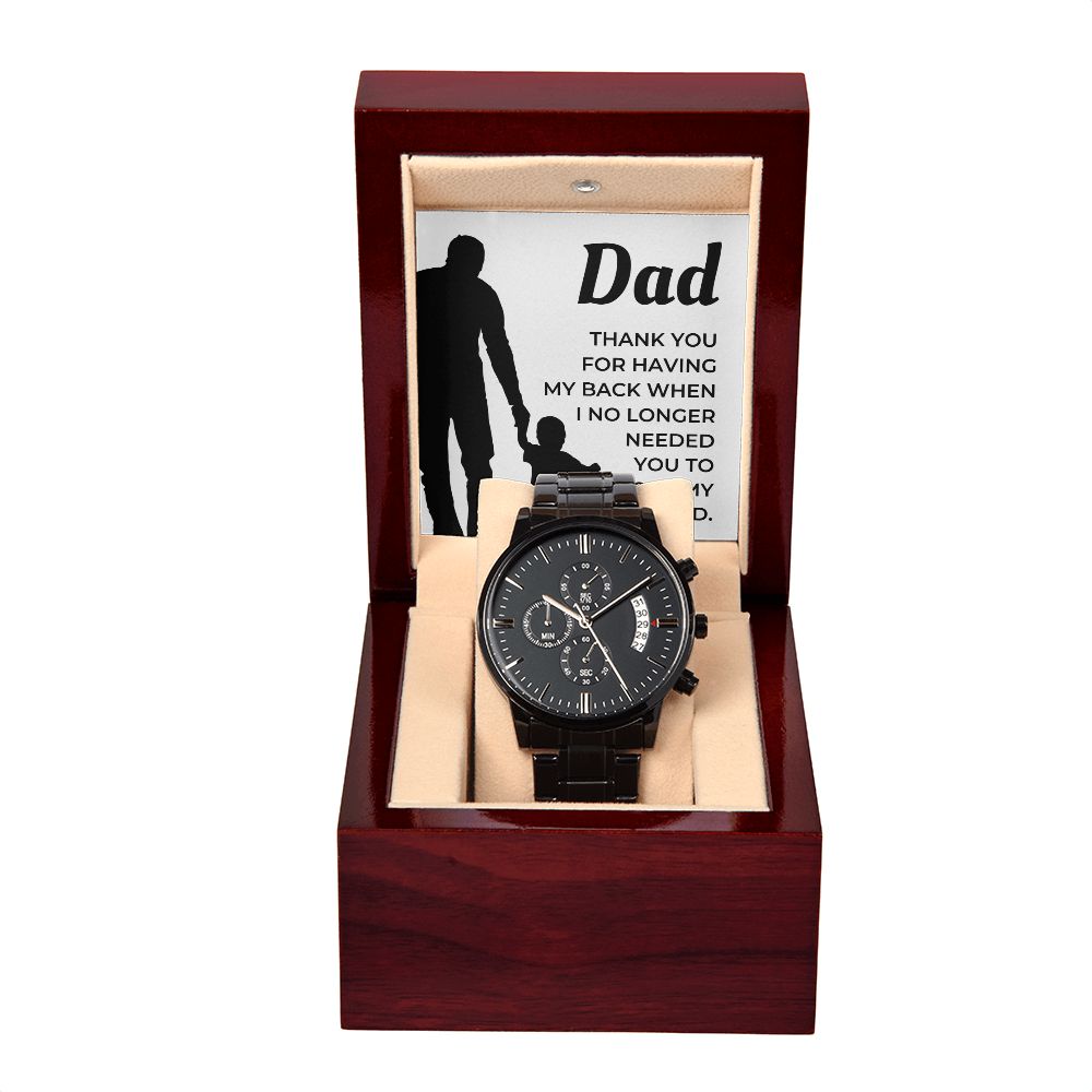 Surprise your dad with a modern design men's watch - a perfect gift for your dad! Our black chronograph watch is made from high-quality stainless steel and features a three-dial face, calendar function, and luxury pointer in a water-resistant and scratch-proof vessel. This beautiful watch is also one of the best unique birthday gift ideas because it comes in a luxury wooden watch box that features a LED light with a sweet, heartfelt message that will surely make your dad feel loved and appreciated!