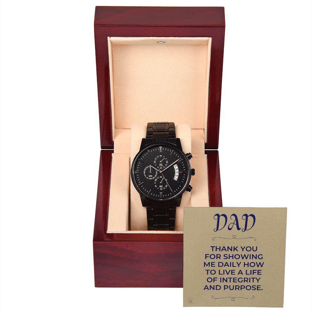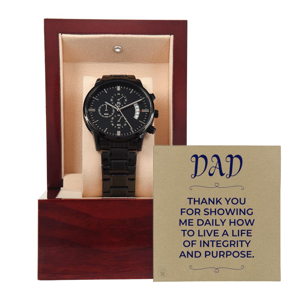 Surprise your dad with a modern design men's watch - a perfect gift for your dad! Our black chronograph watch is made from high-quality stainless steel and features a three-dial face, calendar function, and luxury pointer in a water-resistant and scratch-proof vessel. This beautiful watch is also one of the best unique birthday gift ideas because it comes in a luxury wooden watch box that features a LED light with a sweet, heartfelt message that will surely make your dad feel loved and appreciated!