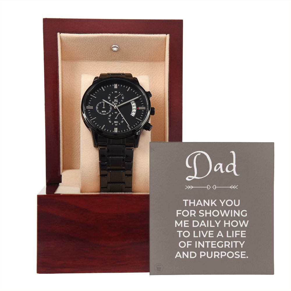 Surprise your dad with a modern design men's watch - a perfect gift for your dad! Our black chronograph watch is made from high-quality stainless steel and features a three-dial face, calendar function, and luxury pointer in a water-resistant and scratch-proof vessel. This beautiful watch is also one of the best unique birthday gift ideas because it comes in a luxury wooden watch box that features a LED light with a sweet, heartfelt message that will surely make your dad feel loved and appreciated!