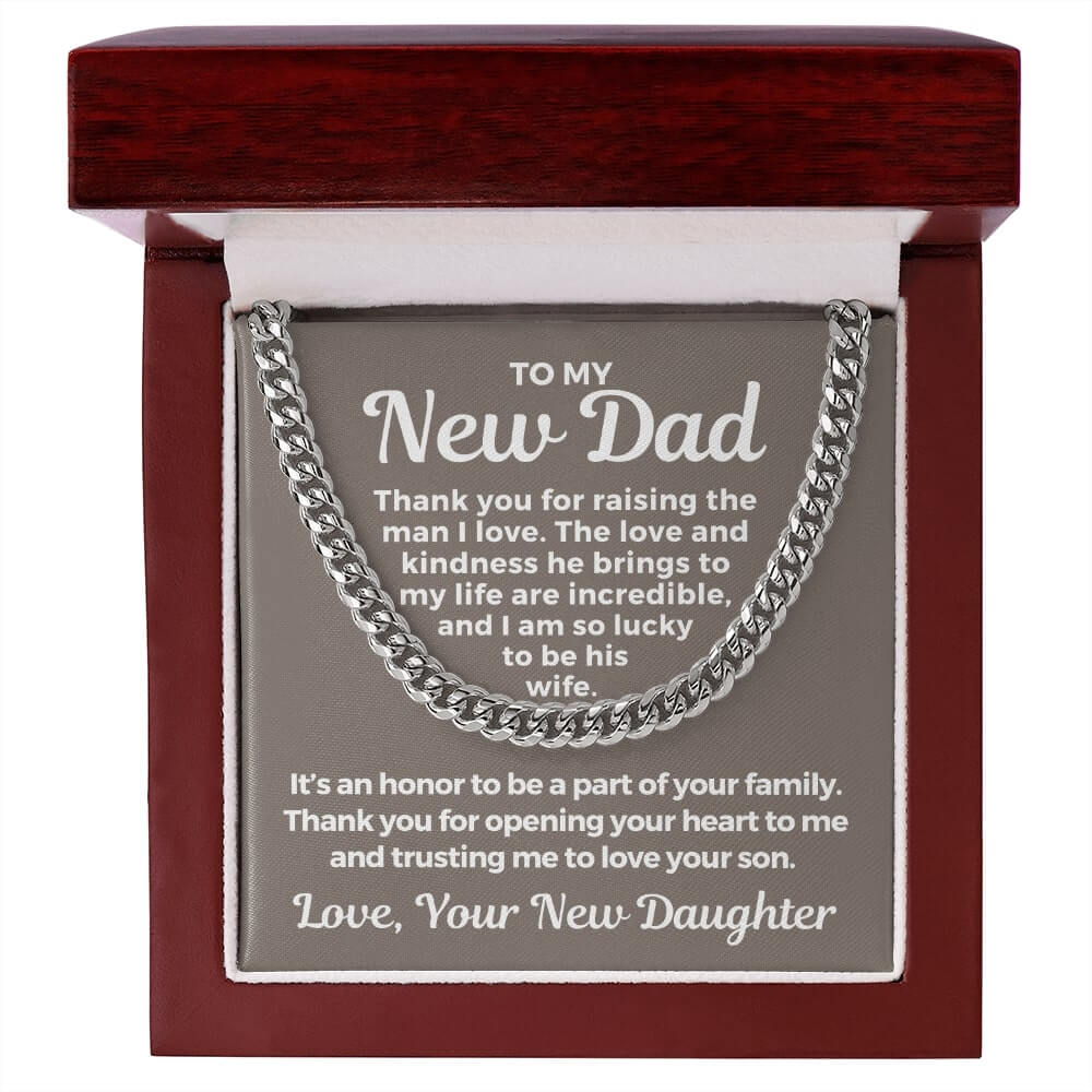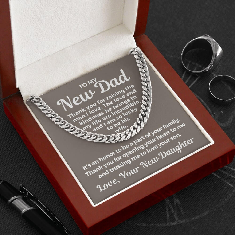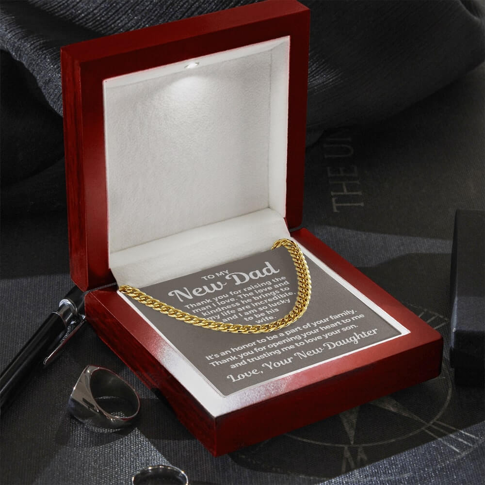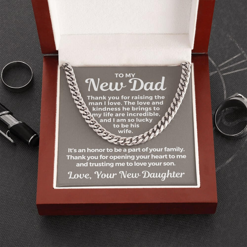 Surprise your future father-in-law with a timeless and stylish Cuban Link Chain necklace that he can wear with almost anything - a perfect gift for any occasion! Our Cuban link necklace is available in polished stainless steel and in a 14k yellow gold over stainless steel finish. The Cuban link necklace has an adjustable chain that measures 18" - 22" and fastens with a parrot clasp to keep it secure. This beautiful necklace is also one of the best unique birthday gift ideas because it comes in a luxury wooden gift box that features a LED light with a sweet, heartfelt message that will surely make your future father-in-law feel loved and appreciated!
