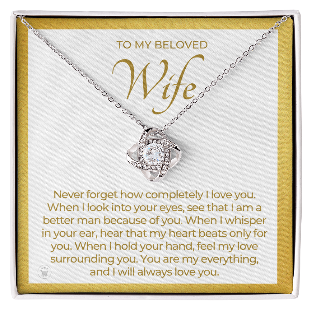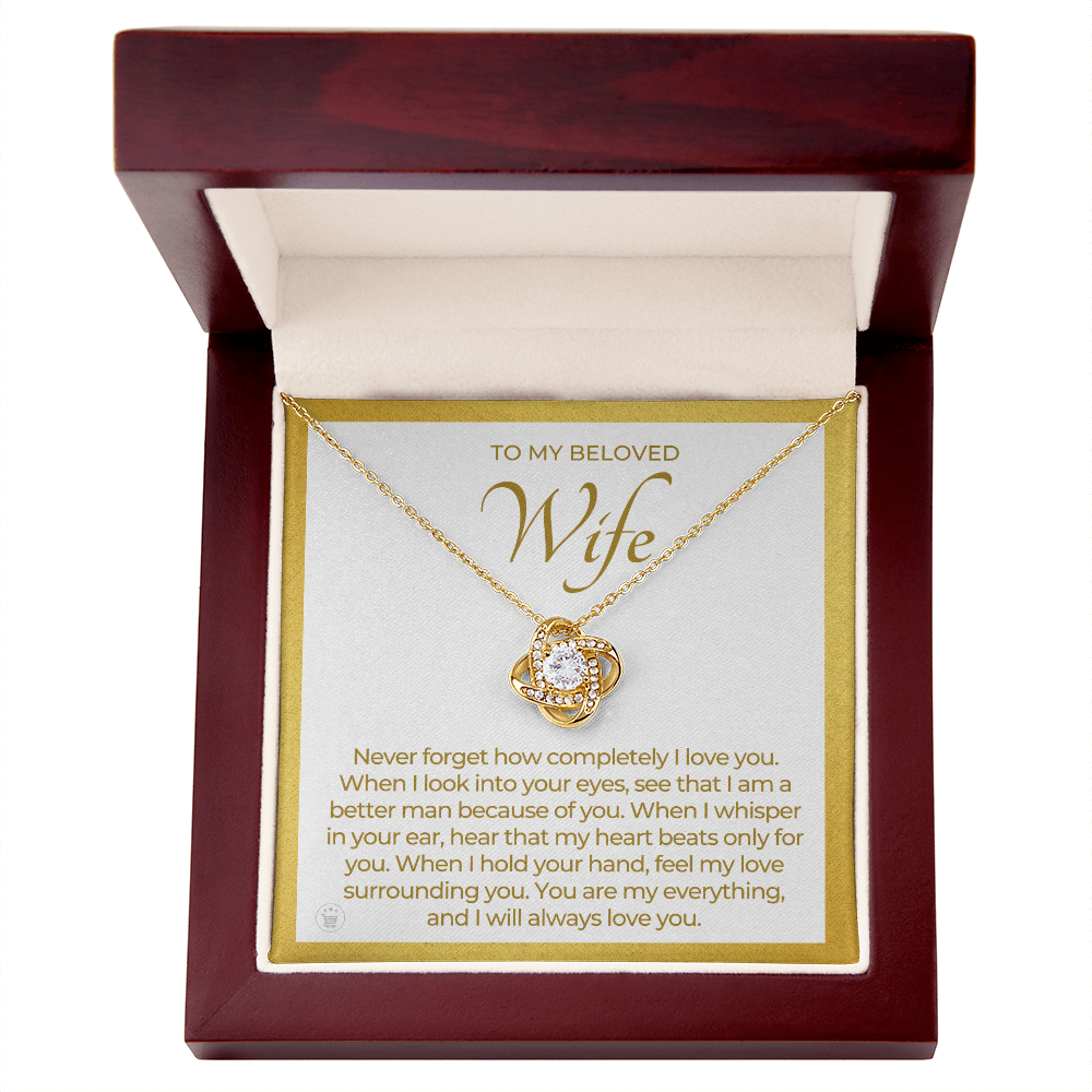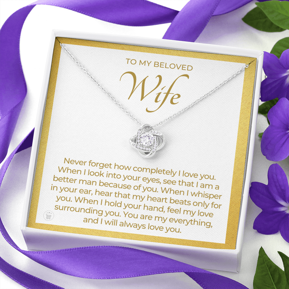 Never forget how completely I love you. When I look into your eyes, see that I am a better man because of you. When I whisper in your ear, hear that my heart beats only for you. When I hold your hand, feel my love surrounding you. You are my everything, and I will always love you.