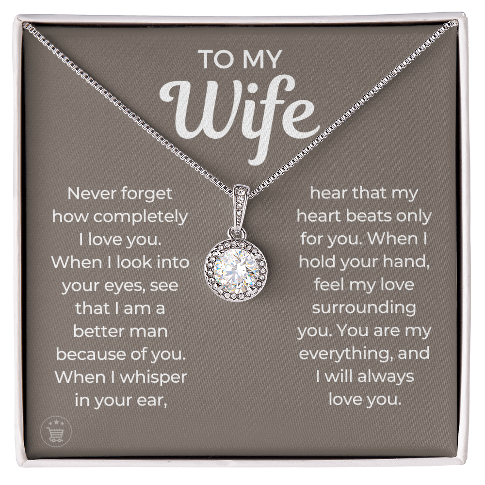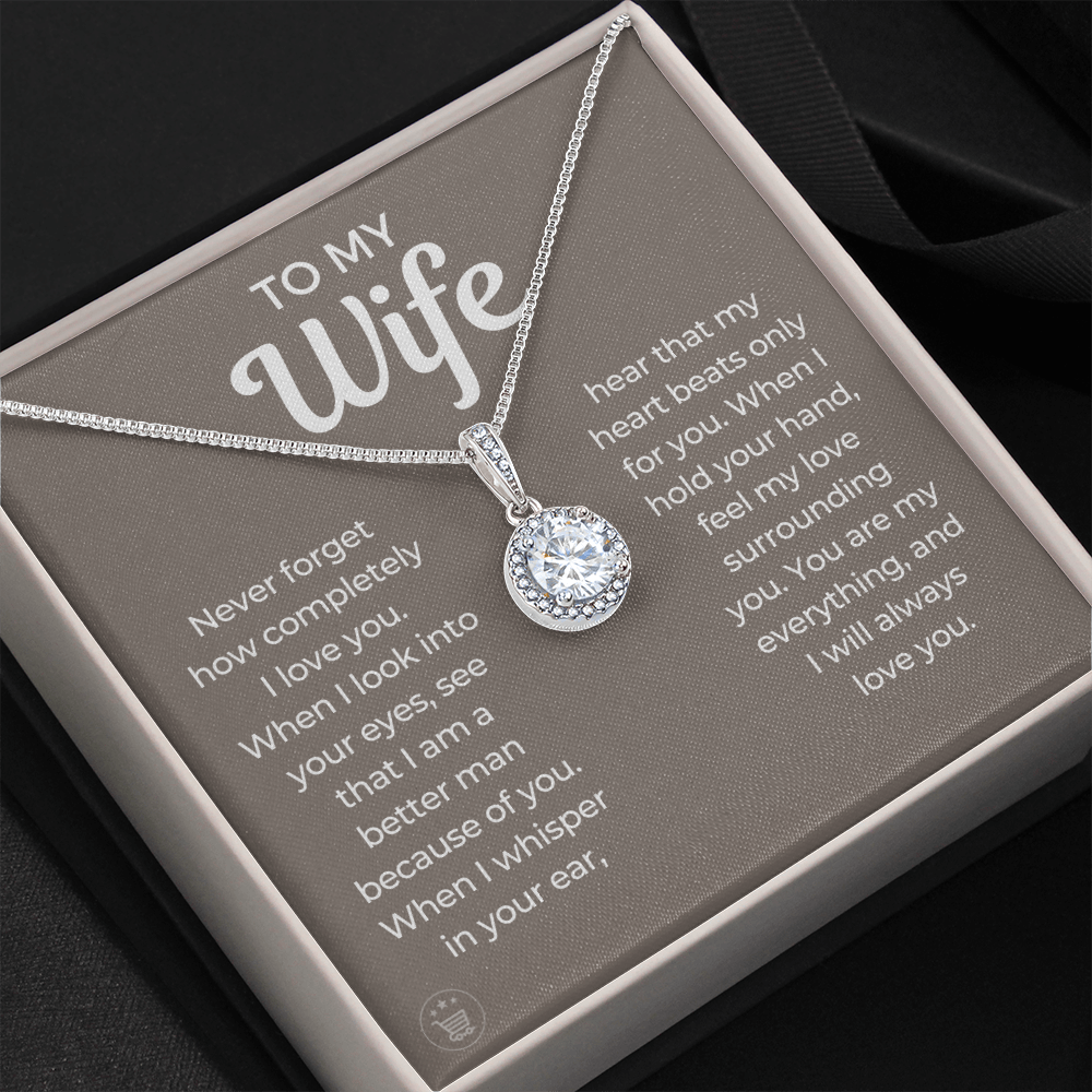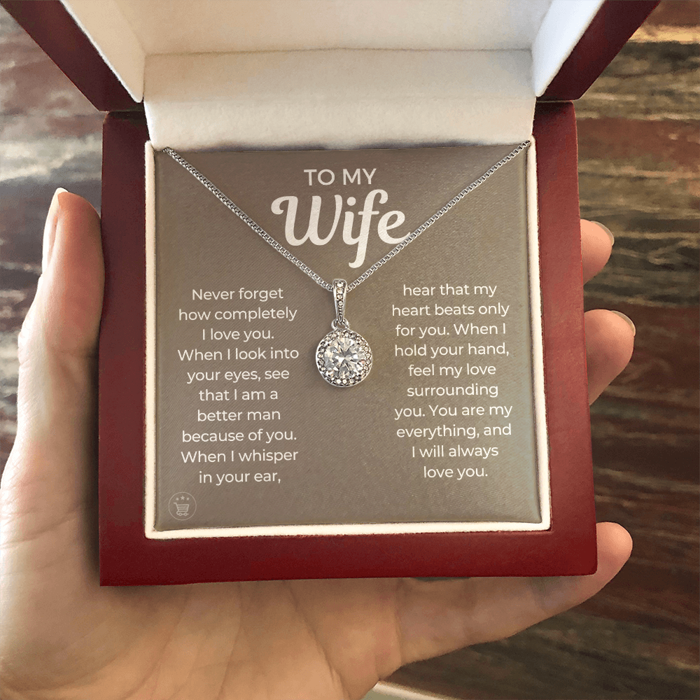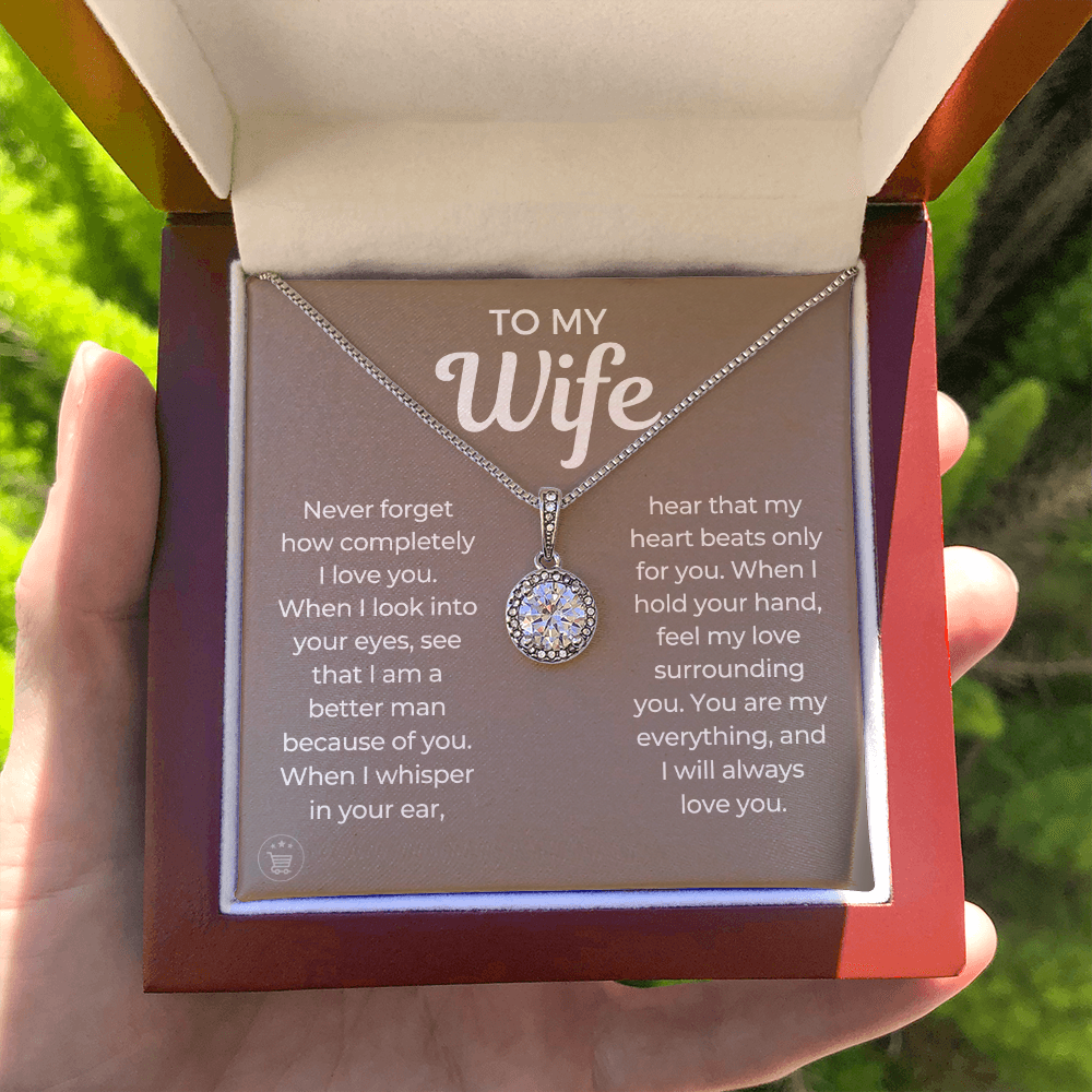 Never forget how completely I love you. When I look into your eyes, see that I am a better man because of you. When I whisper in your ear, hear that my heart beats only for you. When I hold your hand, feel my love surrounding you. You are my everything, and I will always love you.