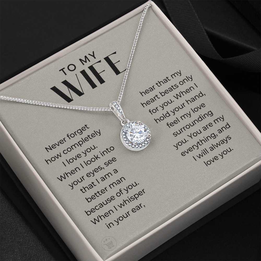 Never forget how completely I love you. When I look into your eyes, see that I am a better man because of you. When I whisper in your ear, hear that my heart beats only for you. When I hold your hand, feel my love surrounding you. You are my everything, and I will always love you.