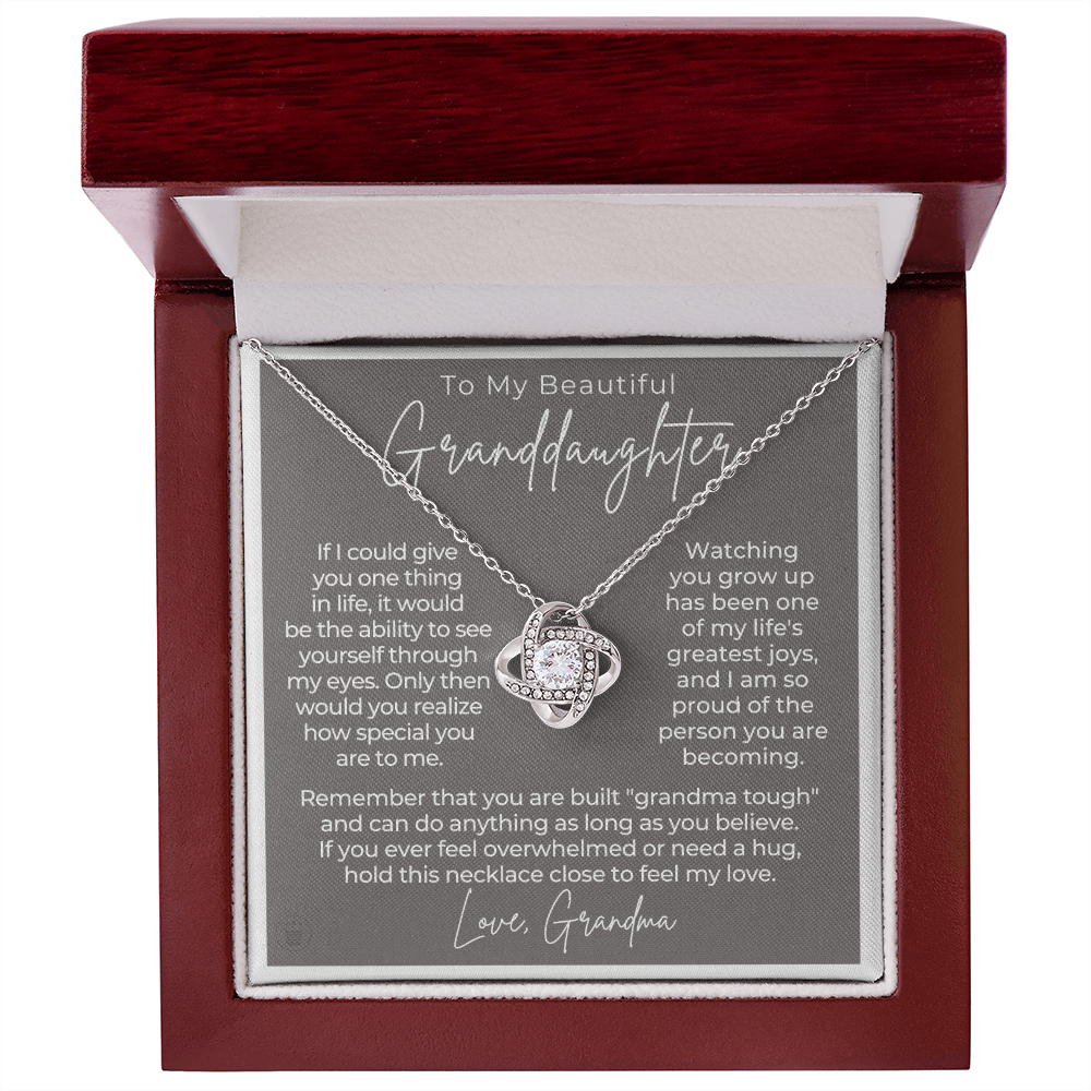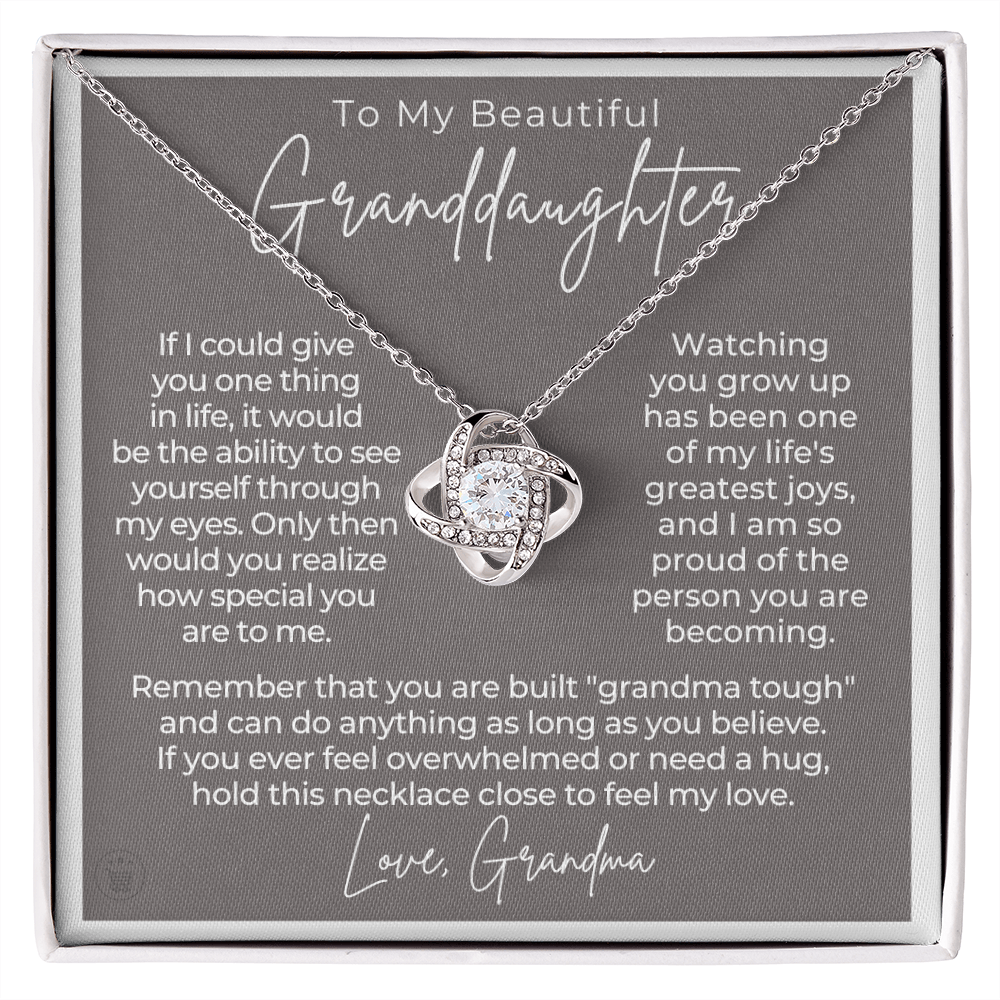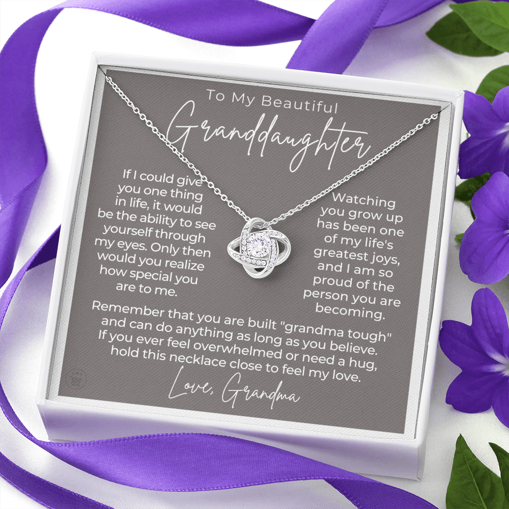 If I could give you one thing in life, it would be the ability to see yourself through my eyes. Only then would you realize how special you are to me. Watching you grow up has been one of my life's greatest joys, and I am so proud of the person you are becoming. Remember that you are built "grandma tough" and can do anything as long as you believe. If you ever feel overwhelmed or need a hug, hold this necklace close to feel my love.