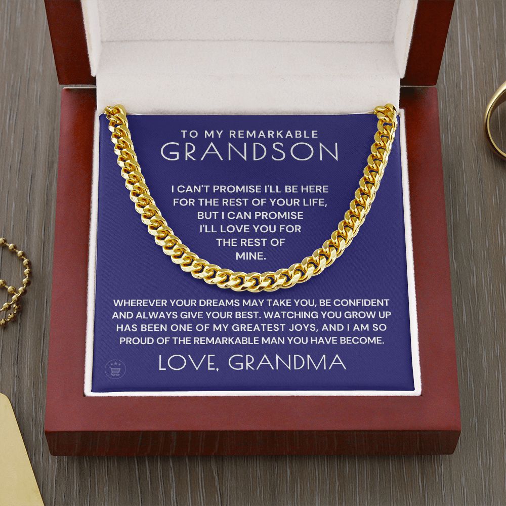 Surprise your grandson with a timeless and stylish Cuban Link Chain - a perfect gift for your grandson! Our Cuban link necklace is available in polished stainless steel and in a 14k yellow gold over stainless steel finish. The Cuban link chain has an adjustable chain that measures 18" - 22" and fastens with a parrot clasp to keep it secure. This beautiful necklace is also one of the best unique birthday gift ideas because it comes in a luxury wooden gift box that features a LED light with a sweet, heartfelt message that will surely make your grandson feel loved and appreciated!