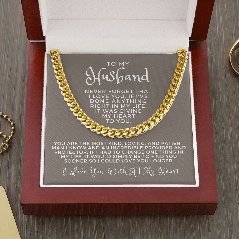 Surprise your husband with a timeless and stylish Cuban Link Chain - a perfect gift for your husband! Our Cuban link necklace is available in polished stainless steel and in a 14k yellow gold over stainless steel finish. The Cuban link chain has an adjustable chain that measures 18" - 22" and fastens with a parrot clasp to keep it secure. This beautiful necklace is also one of the best unique birthday gift ideas because it comes in a luxury wooden gift box that features a LED light with a sweet, heartfelt message that will surely make your husband feel loved and appreciated!