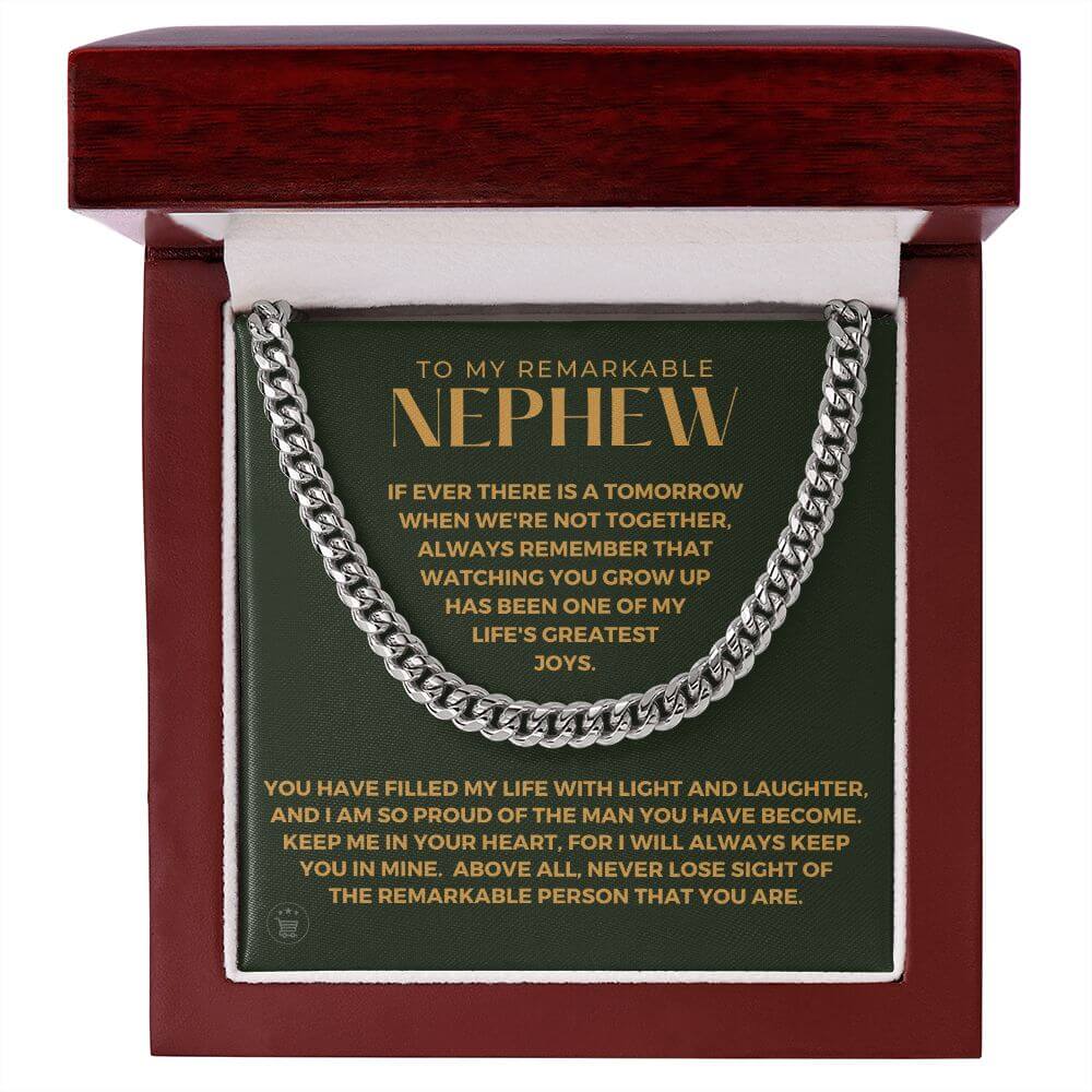 Surprise your nephew with a timeless and stylish Cuban Link Chain - a perfect gift for your nephew! Our Cuban link necklace is available in polished stainless steel and in a 14k yellow gold over stainless steel finish. The Cuban link chain has an adjustable chain that measures 18" - 22" and fastens with a parrot clasp to keep it secure. This beautiful necklace is also one of the best unique birthday gift ideas because it comes in a luxury wooden gift box that features a LED light with a sweet, heartfelt message that will surely make your nephew feel loved and appreciated!