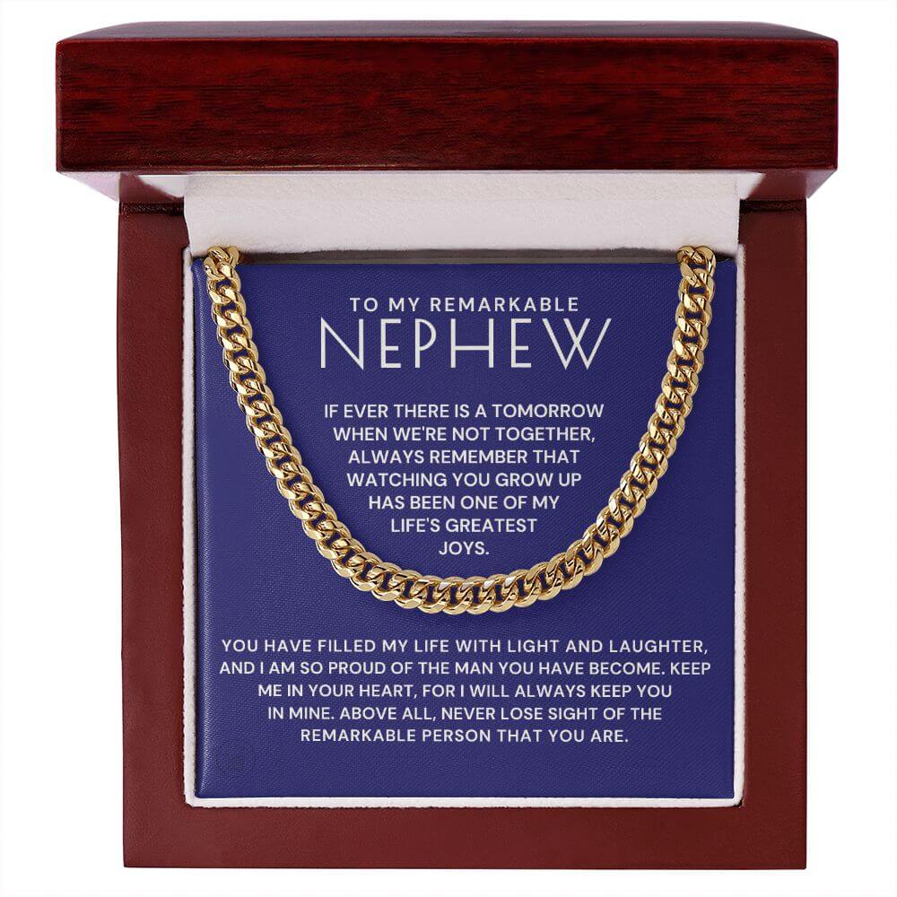 Surprise your nephew with a timeless and stylish Cuban Link Chain - a perfect gift for your nephew! Our Cuban link necklace is available in polished stainless steel and in a 14k yellow gold over stainless steel finish. The Cuban link chain has an adjustable chain that measures 18" - 22" and fastens with a parrot clasp to keep it secure. This beautiful necklace is also one of the best unique birthday gift ideas because it comes in a luxury wooden gift box that features a LED light with a sweet, heartfelt message that will surely make your nephew feel loved and appreciated!
