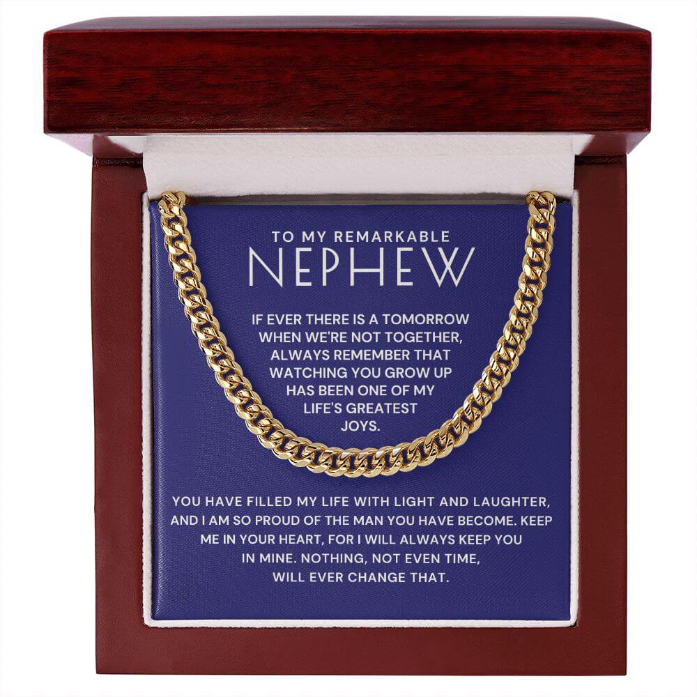 Surprise your nephew with a timeless and stylish Cuban Link Chain - a perfect gift for your nephew! Our Cuban link necklace is available in polished stainless steel and in a 14k yellow gold over stainless steel finish. The Cuban link chain has an adjustable chain that measures 18" - 22" and fastens with a parrot clasp to keep it secure. This beautiful necklace is also one of the best unique birthday gift ideas because it comes in a luxury wooden gift box that features a LED light with a sweet, heartfelt message that will surely make your nephew feel loved and appreciated!