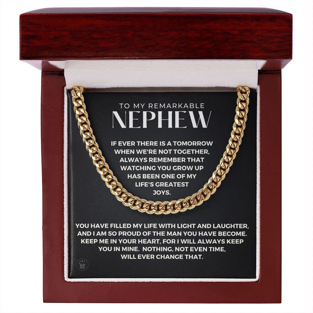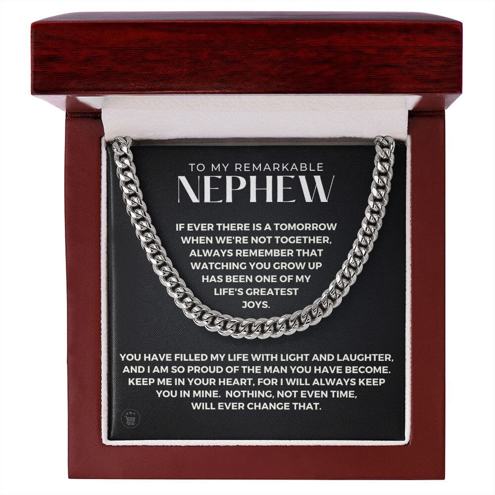 Surprise your nephew with a timeless and stylish Cuban Link Chain - a perfect gift for your nephew! Our Cuban link necklace is available in polished stainless steel and in a 14k yellow gold over stainless steel finish. The Cuban link chain has an adjustable chain that measures 18" - 22" and fastens with a parrot clasp to keep it secure. This beautiful necklace is also one of the best unique birthday gift ideas because it comes in a luxury wooden gift box that features a LED light with a sweet, heartfelt message that will surely make your nephew feel loved and appreciated!