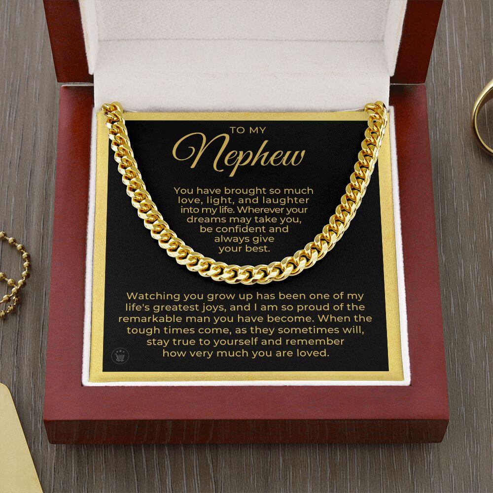 Surprise your nephew with a timeless and stylish Cuban Link Chain - a perfect gift for your nephew! Our Cuban link necklace is available in polished stainless steel and in a 14k yellow gold over stainless steel finish. The Cuban link chain has an adjustable chain that measures 18" - 22" and fastens with a parrot clasp to keep it secure. This beautiful necklace is also one of the best unique birthday gift ideas because it comes in a luxury wooden gift box that features a LED light with a sweet, heartfelt message that will surely make your nephew feel loved and appreciated!