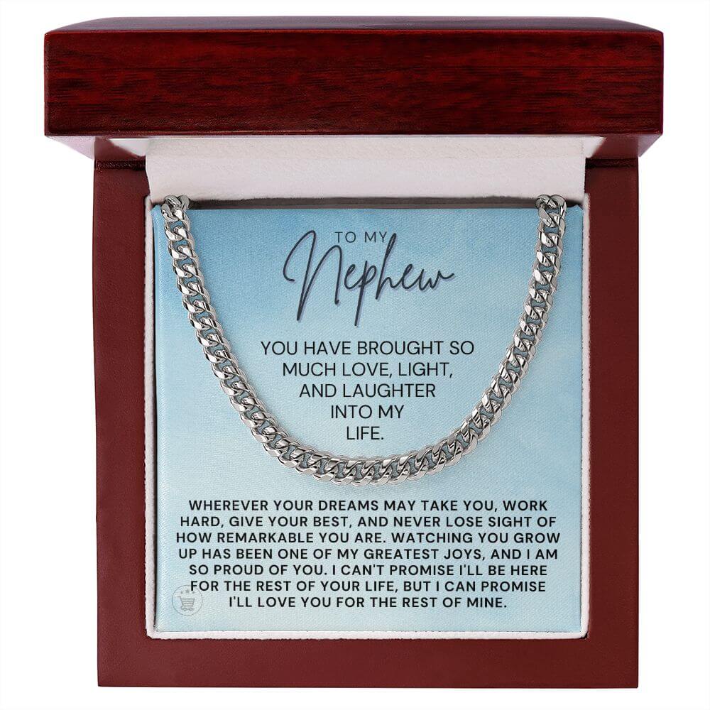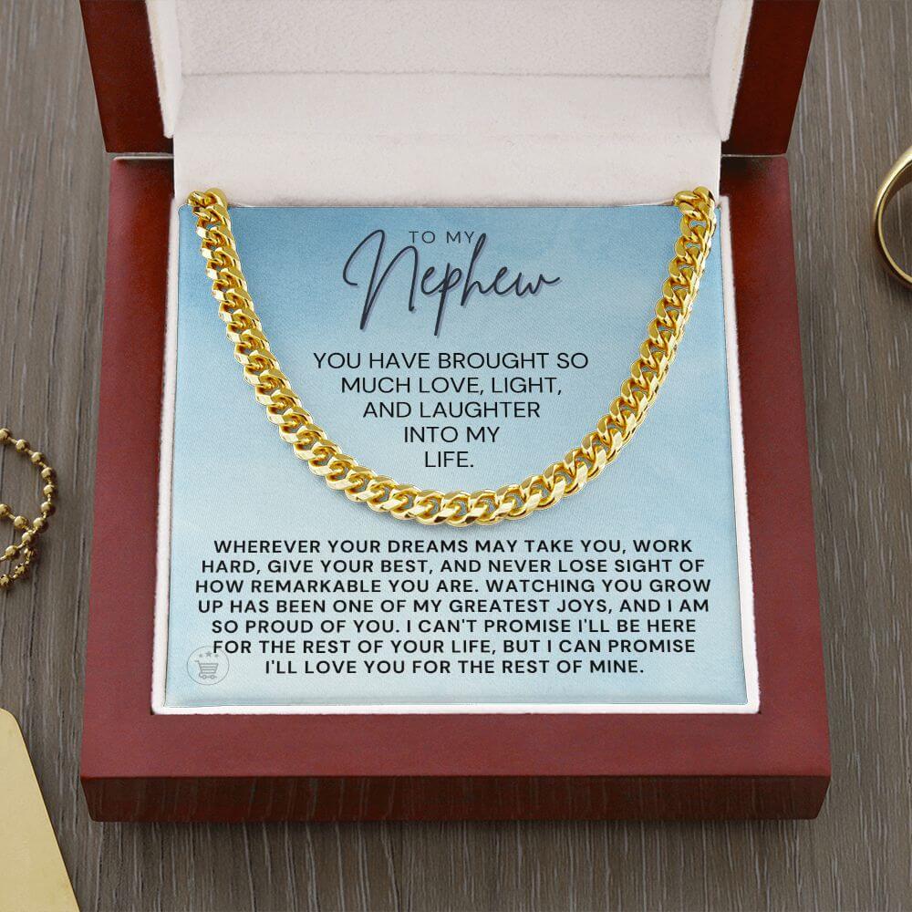 Surprise your nephew with a timeless and stylish Cuban Link Chain - a perfect gift for your nephew! Our Cuban link necklace is available in polished stainless steel and in a 14k yellow gold over stainless steel finish. The Cuban link chain has an adjustable chain that measures 18" - 22" and fastens with a parrot clasp to keep it secure. This beautiful necklace is also one of the best unique birthday gift ideas because it comes in a luxury wooden gift box that features a LED light with a sweet, heartfelt message that will surely make your nephew feel loved and appreciated!