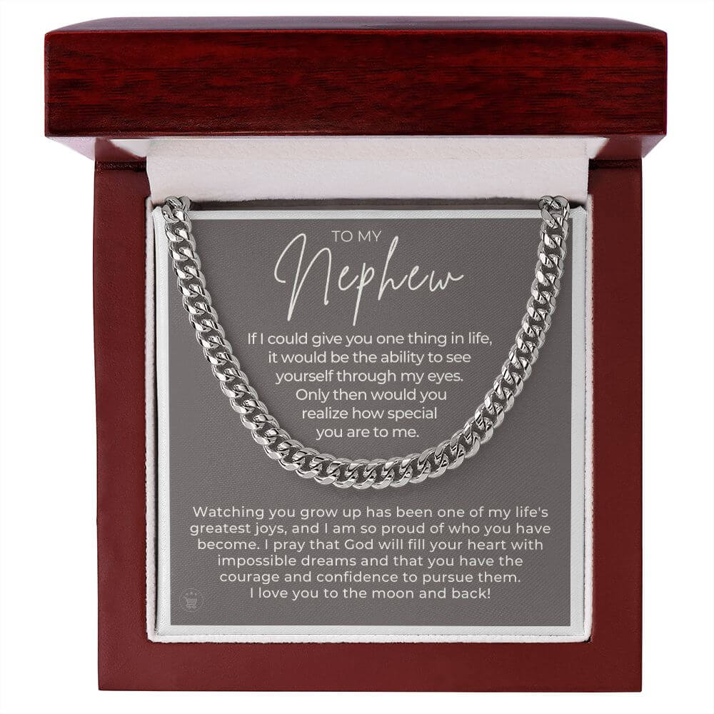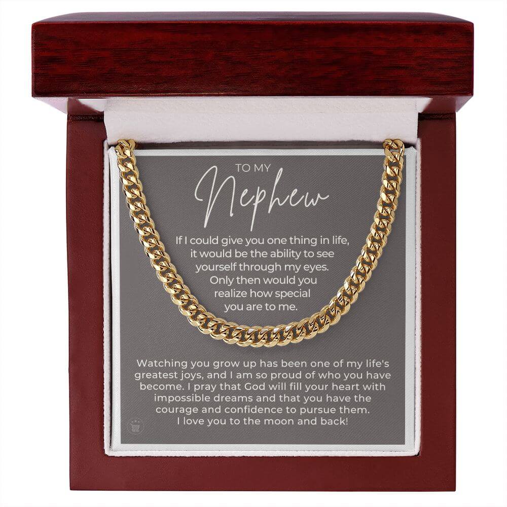 Surprise your nephew with a timeless and stylish Cuban Link Chain - a perfect gift for your nephew! Our Cuban link necklace is available in polished stainless steel and in a 14k yellow gold over stainless steel finish. The Cuban link chain has an adjustable chain that measures 18" - 22" and fastens with a parrot clasp to keep it secure. This beautiful necklace is also one of the best unique birthday gift ideas because it comes in a luxury wooden gift box that features a LED light with a sweet, heartfelt message that will surely make your nephew feel loved and appreciated!