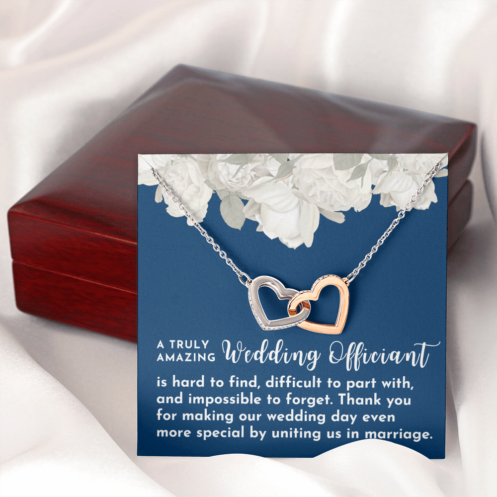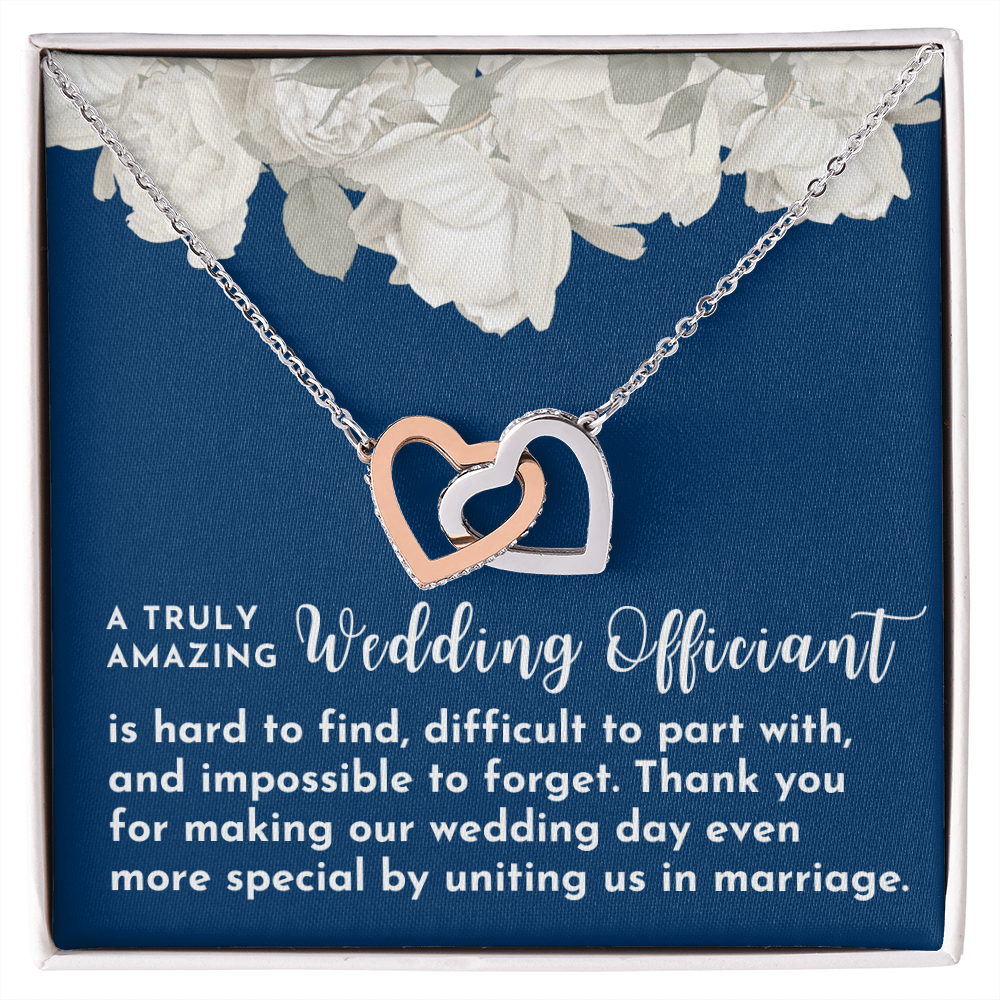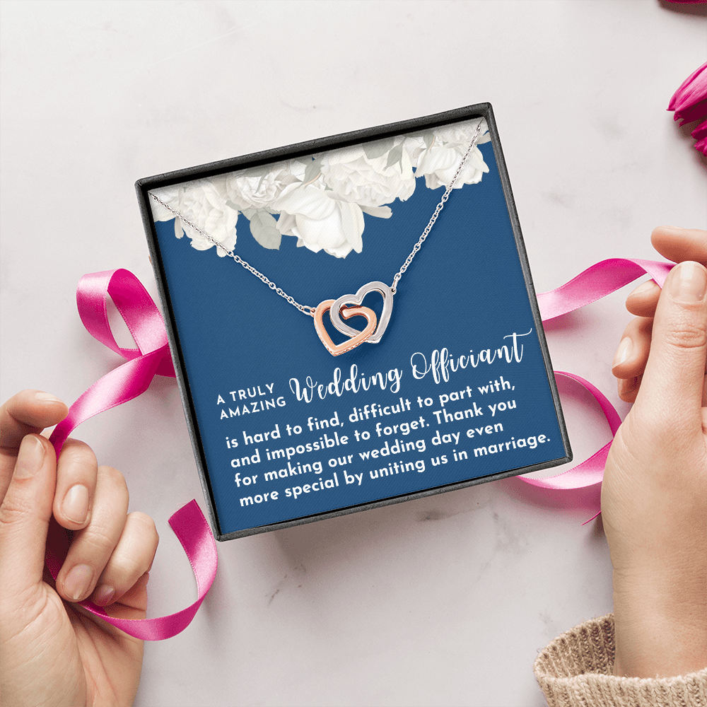 Are you looking for a unique gift to ask someone to be your wedding officiant or to thank the best wedding officiant ever for uniting you in marriage? The small pendant necklace features polished stainless steel and rose gold hearts interlocked together and embellished with cubic zirconia stones, adding extra sparkle and shine. Our pendant necklace comes in an elegant gift box with a sweet message that will surely make your wedding officiant feel loved and appreciated!