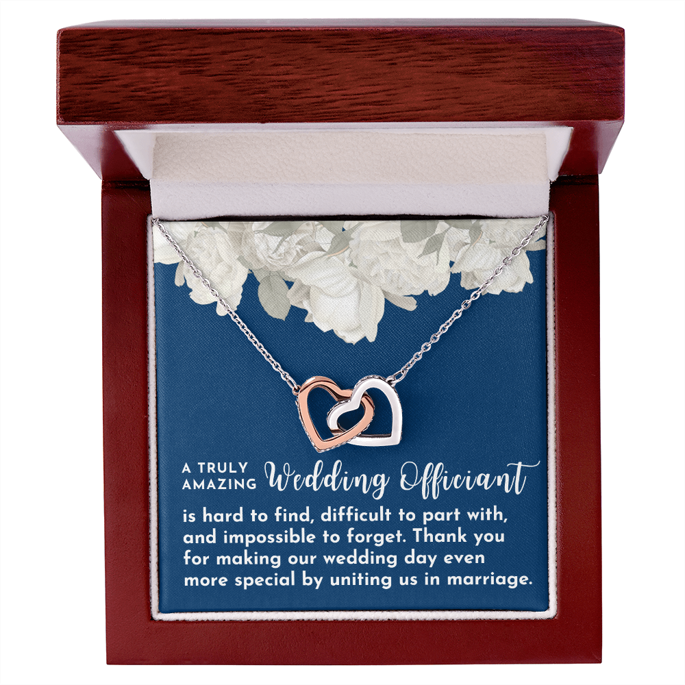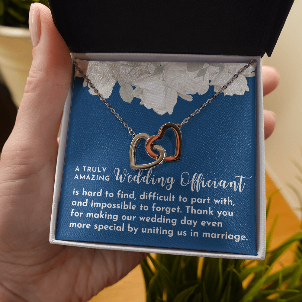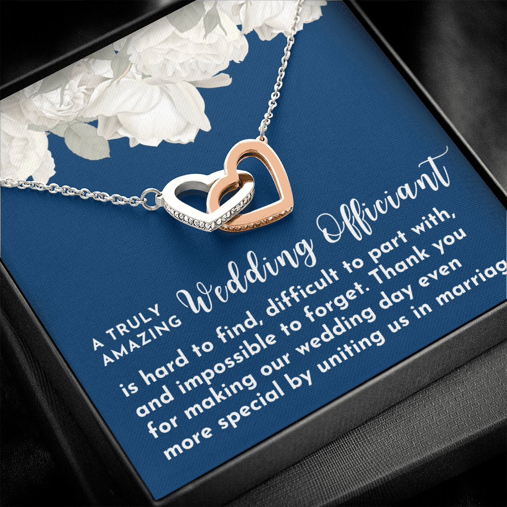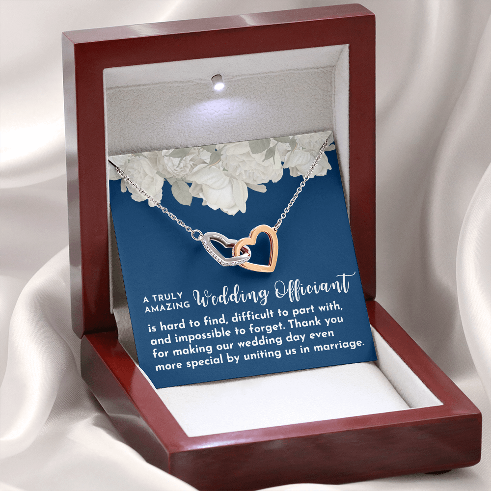 Are you looking for a unique gift to ask someone to be your wedding officiant or to thank the best wedding officiant ever for uniting you in marriage? The small pendant necklace features polished stainless steel and rose gold hearts interlocked together and embellished with cubic zirconia stones, adding extra sparkle and shine. Our pendant necklace comes in an elegant gift box with a sweet message that will surely make your wedding officiant feel loved and appreciated!