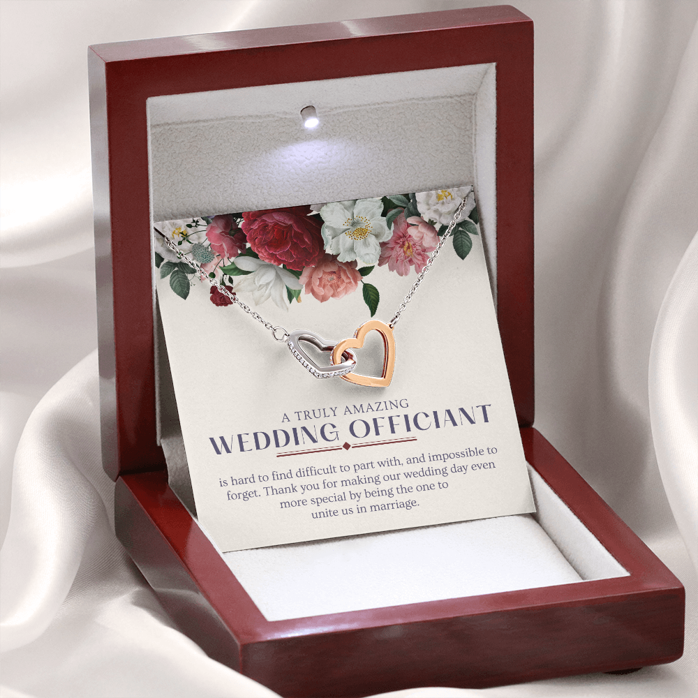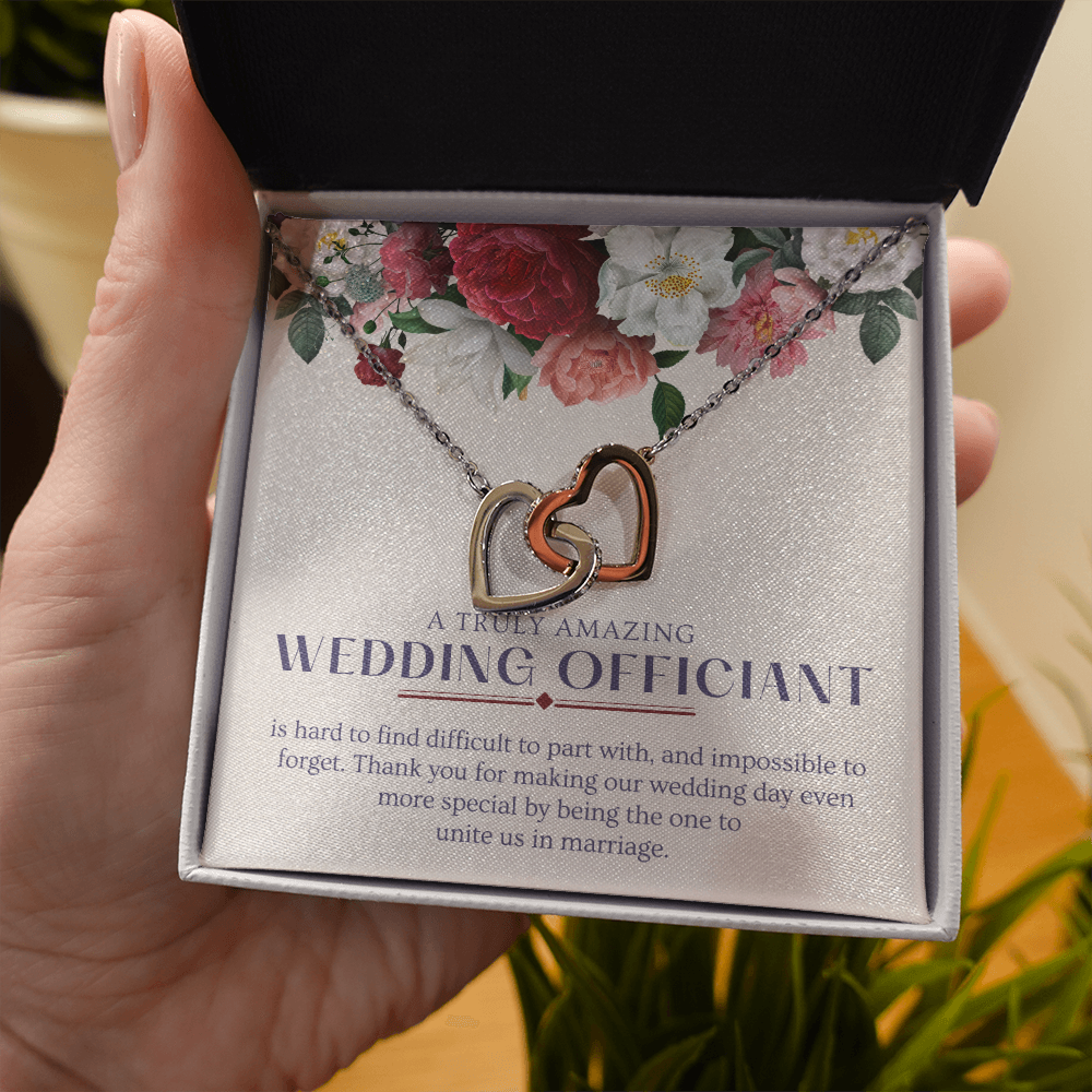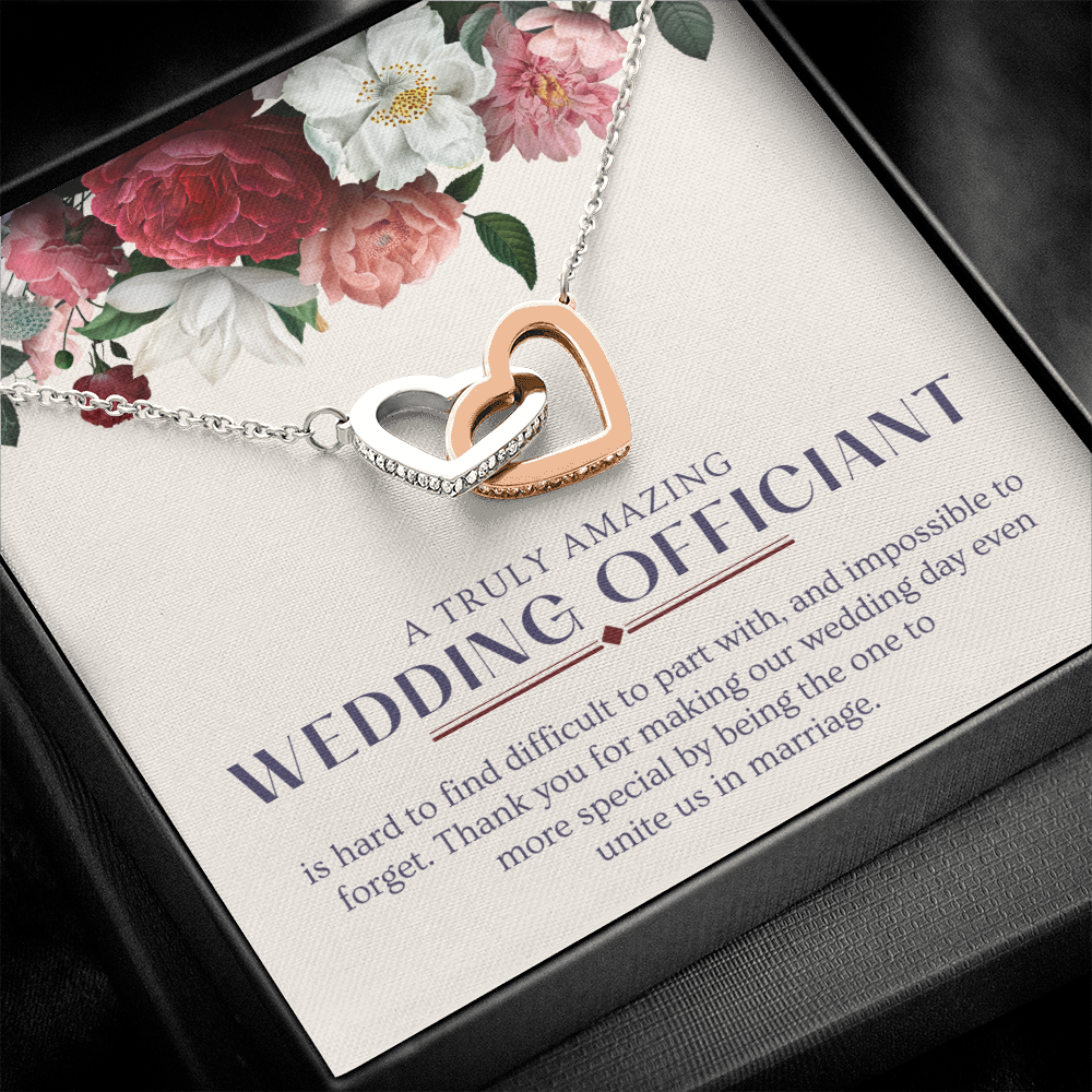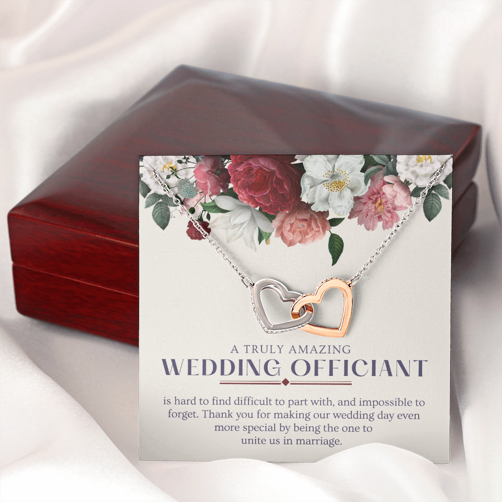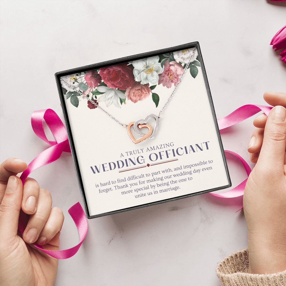 Are you looking for a unique gift to ask someone to be your wedding officiant or to thank the best wedding officiant ever for uniting you in marriage? The small pendant necklace features polished stainless steel and rose gold hearts interlocked together and embellished with cubic zirconia stones, adding extra sparkle and shine. Our pendant necklace comes in an elegant gift box with a sweet message that will surely make your wedding officiant feel loved and appreciated!