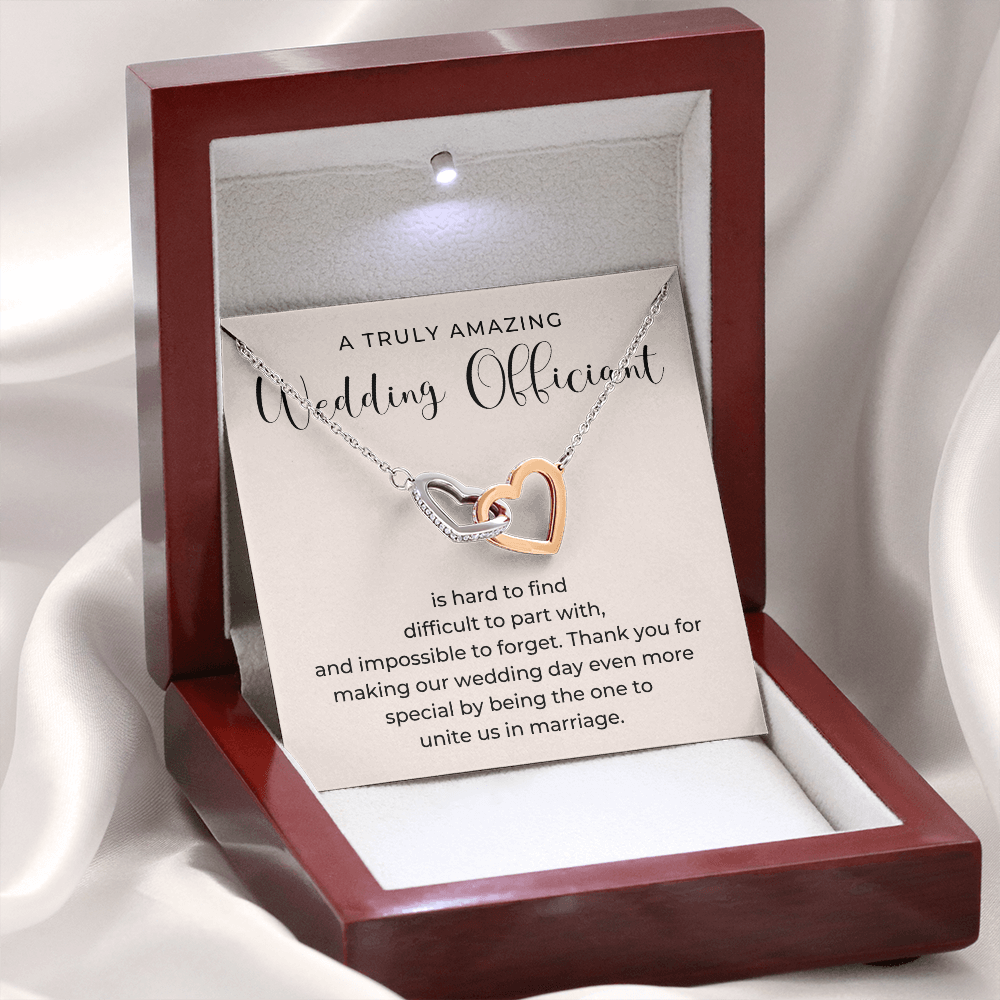 Are you looking for a unique gift to ask someone to be your wedding officiant or to thank the best wedding officiant ever for uniting you in marriage? The small pendant necklace features polished stainless steel and rose gold hearts interlocked together and embellished with cubic zirconia stones, adding extra sparkle and shine. Our pendant necklace comes in an elegant gift box with a sweet message that will surely make your wedding officiant feel loved and appreciated!