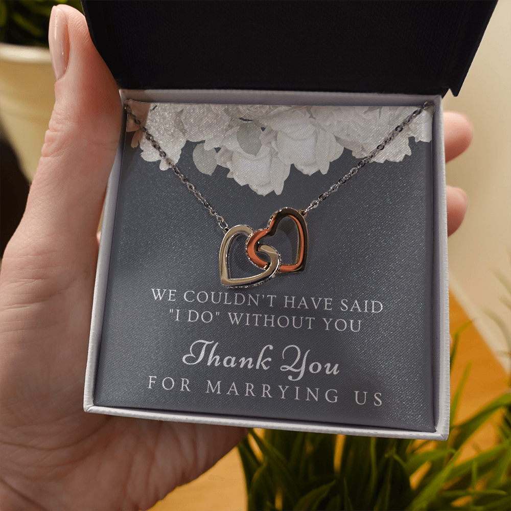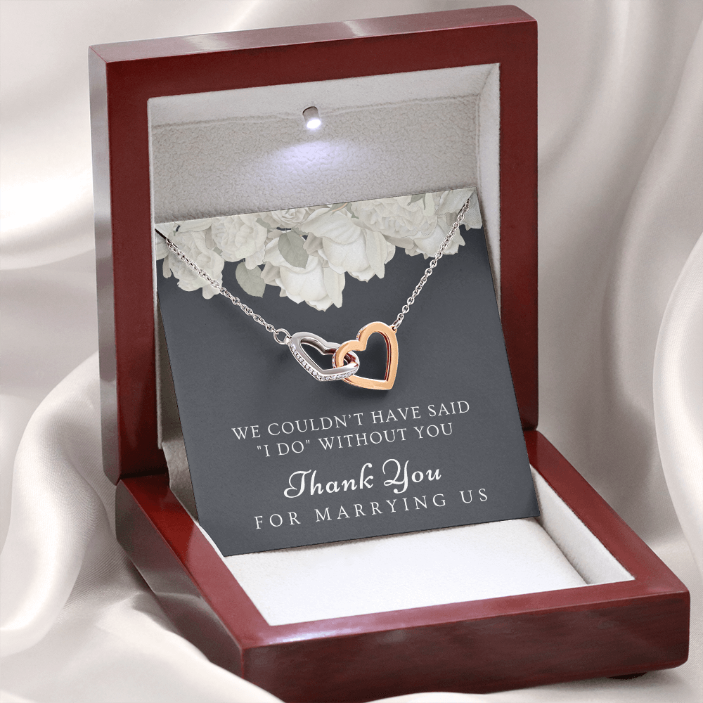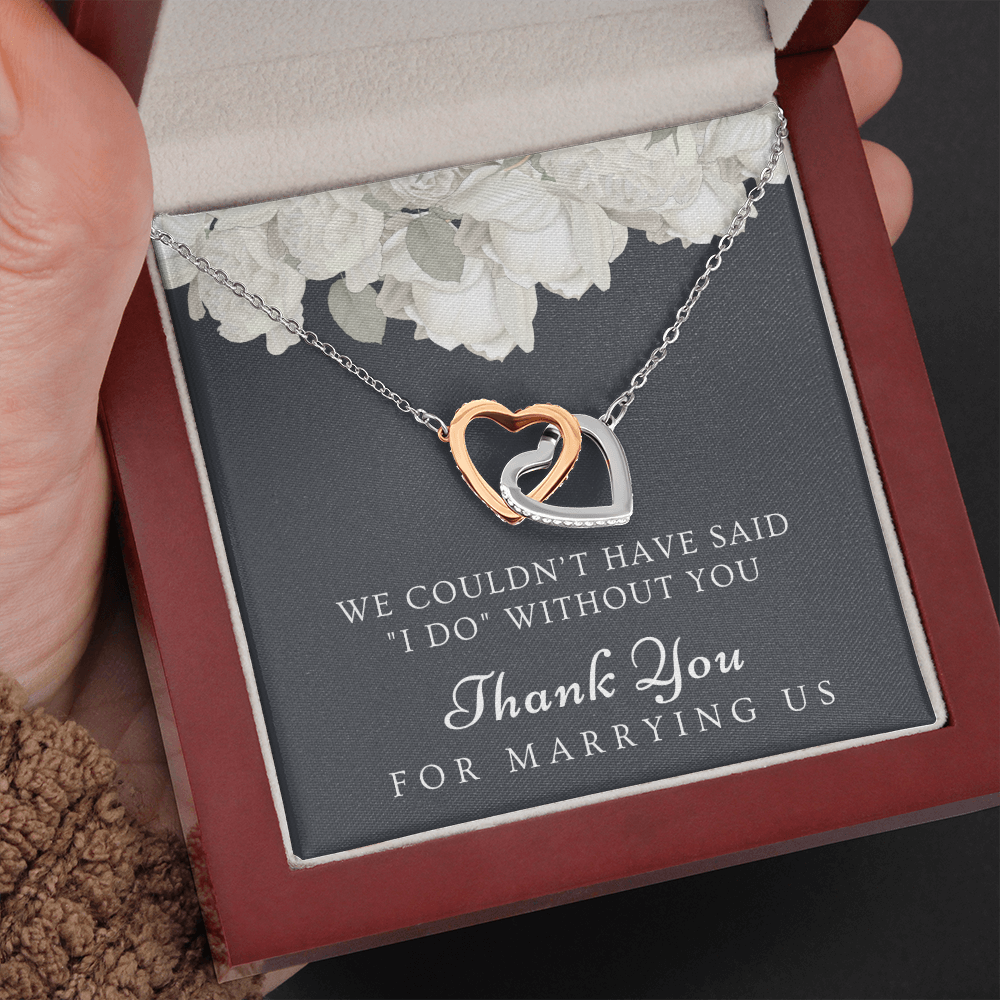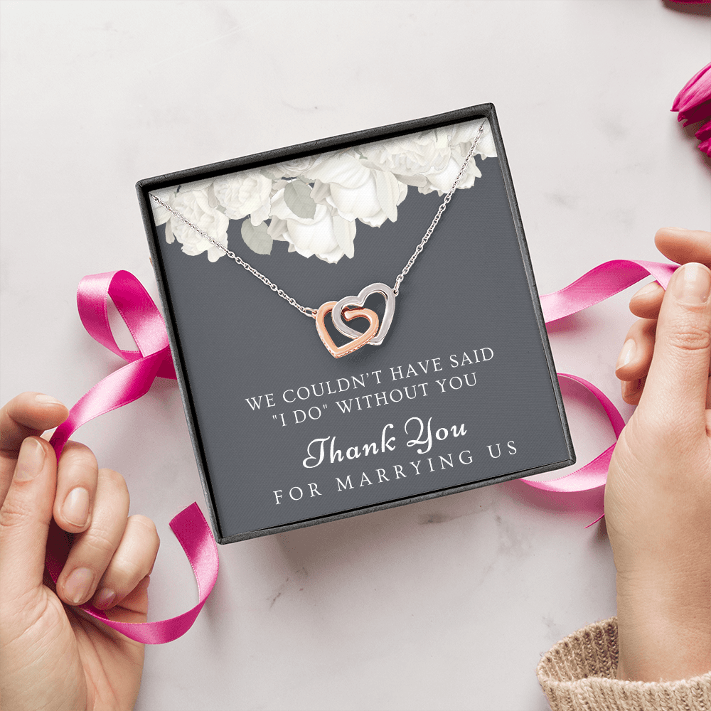 Are you looking for a unique gift to ask someone to be your wedding officiant or to thank the best wedding officiant ever for uniting you in marriage? The small pendant necklace features polished stainless steel and rose gold hearts interlocked together and embellished with cubic zirconia stones, adding extra sparkle and shine. Our pendant necklace comes in an elegant gift box with a sweet message that will surely make your wedding officiant feel loved and appreciated!