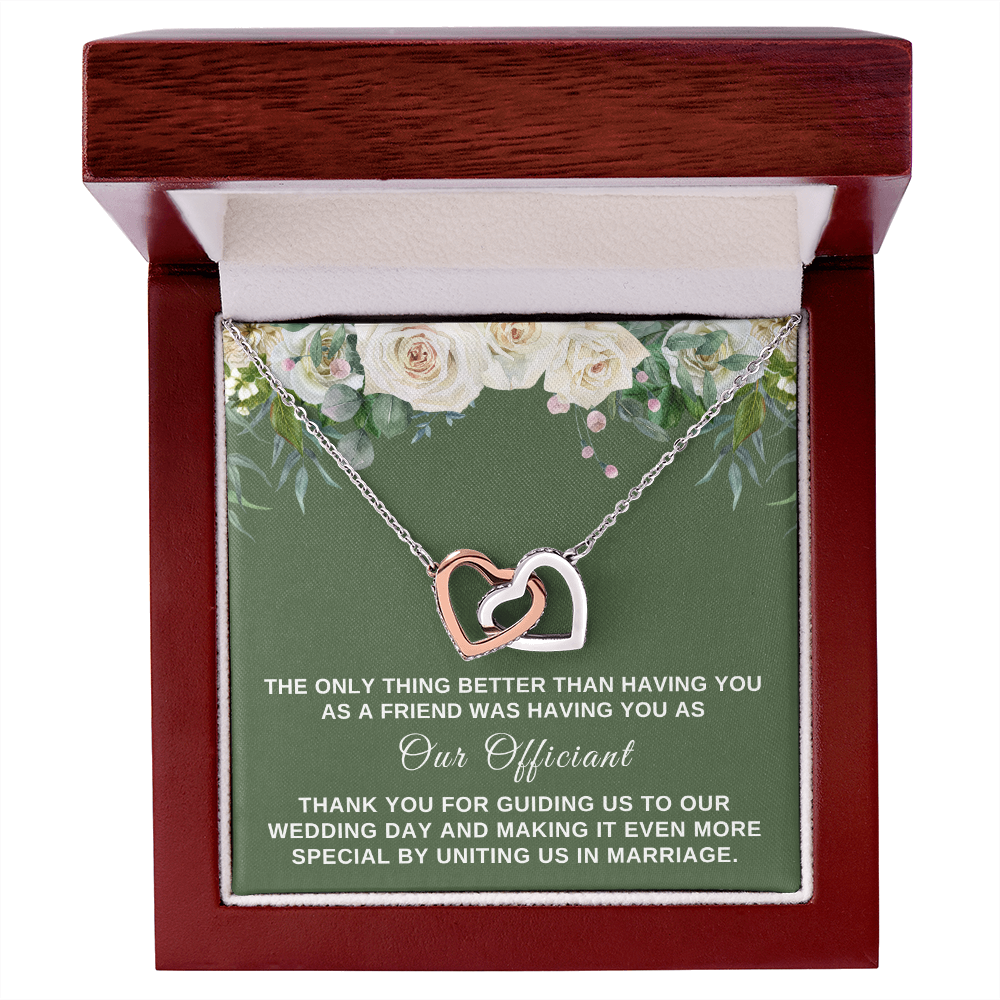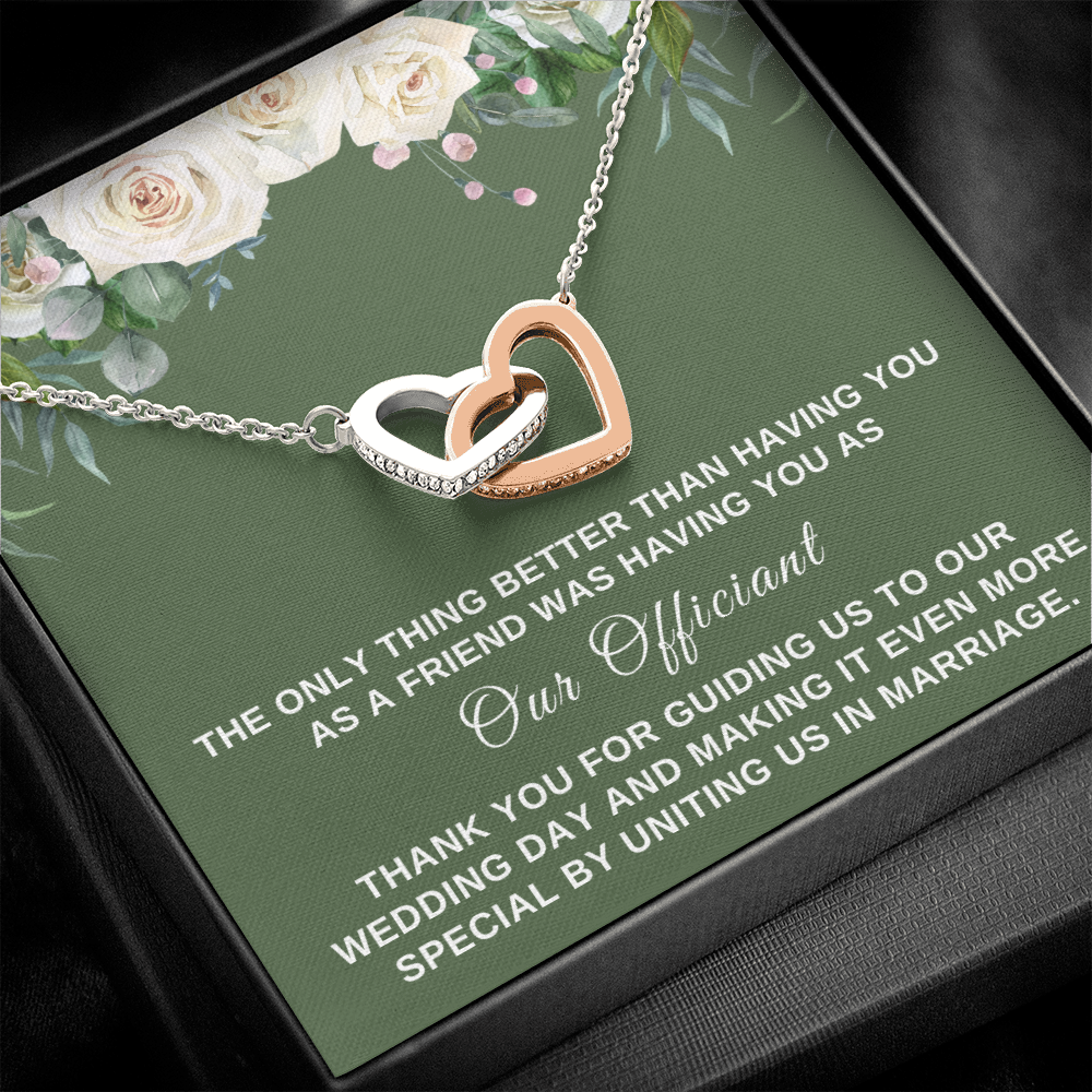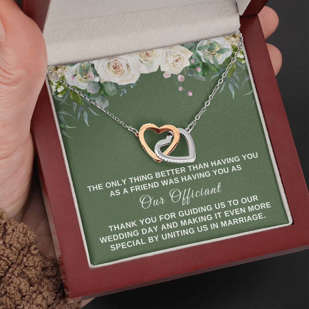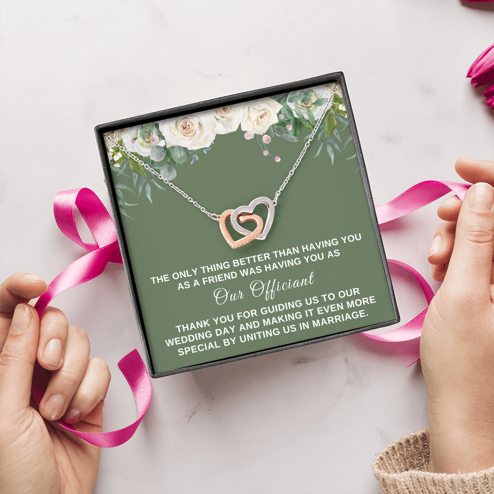 Are you looking for a unique gift to ask someone to be your wedding officiant or to thank the best wedding officiant ever for uniting you in marriage? The small pendant necklace features polished stainless steel and rose gold hearts interlocked together and embellished with cubic zirconia stones, adding extra sparkle and shine. Our pendant necklace comes in an elegant gift box with a sweet message that will surely make your wedding officiant feel loved and appreciated!
