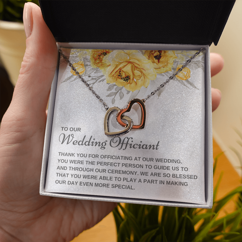 Are you looking for a unique gift to ask someone to be your wedding officiant or to thank the best wedding officiant ever for uniting you in marriage? The small pendant necklace features polished stainless steel and rose gold hearts interlocked together and embellished with cubic zirconia stones, adding extra sparkle and shine. Our pendant necklace comes in an elegant gift box with a sweet message that will surely make your wedding officiant feel loved and appreciated!
