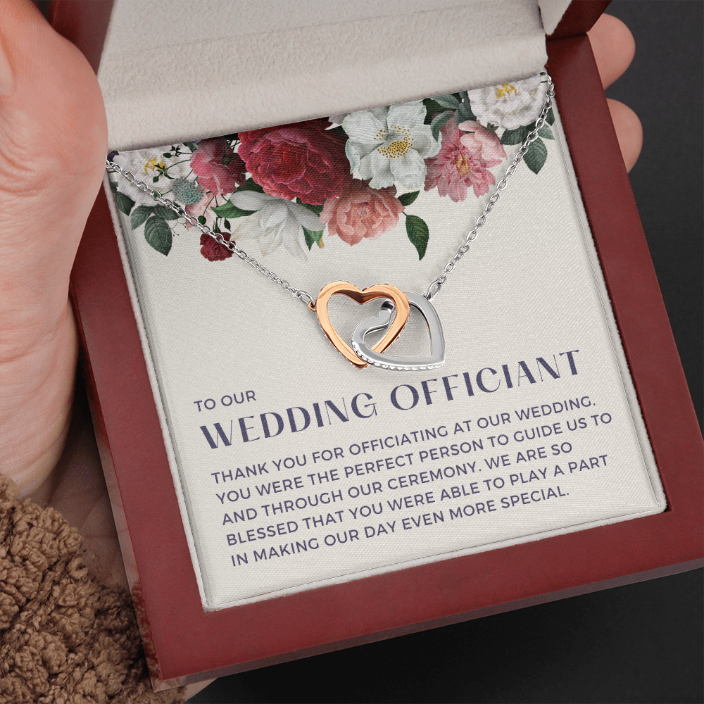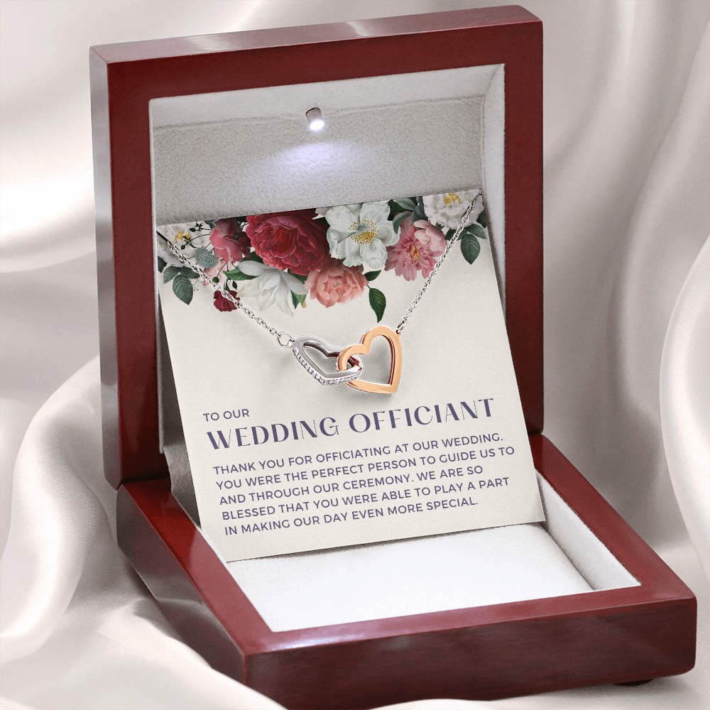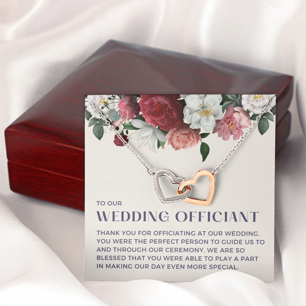 Are you looking for a unique gift to ask someone to be your wedding officiant or to thank the best wedding officiant ever for uniting you in marriage? The small pendant necklace features polished stainless steel and rose gold hearts interlocked together and embellished with cubic zirconia stones, adding extra sparkle and shine. Our pendant necklace comes in an elegant gift box with a sweet message that will surely make your wedding officiant feel loved and appreciated!