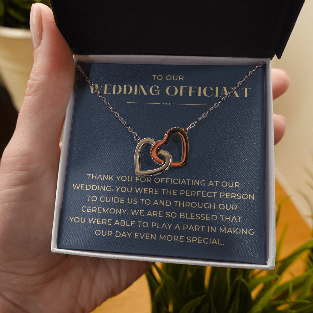 Are you looking for a unique gift to ask someone to be your wedding officiant or to thank the best wedding officiant ever for uniting you in marriage? The small pendant necklace features polished stainless steel and rose gold hearts interlocked together and embellished with cubic zirconia stones, adding extra sparkle and shine. Our pendant necklace comes in an elegant gift box with a sweet message that will surely make your wedding officiant feel loved and appreciated!