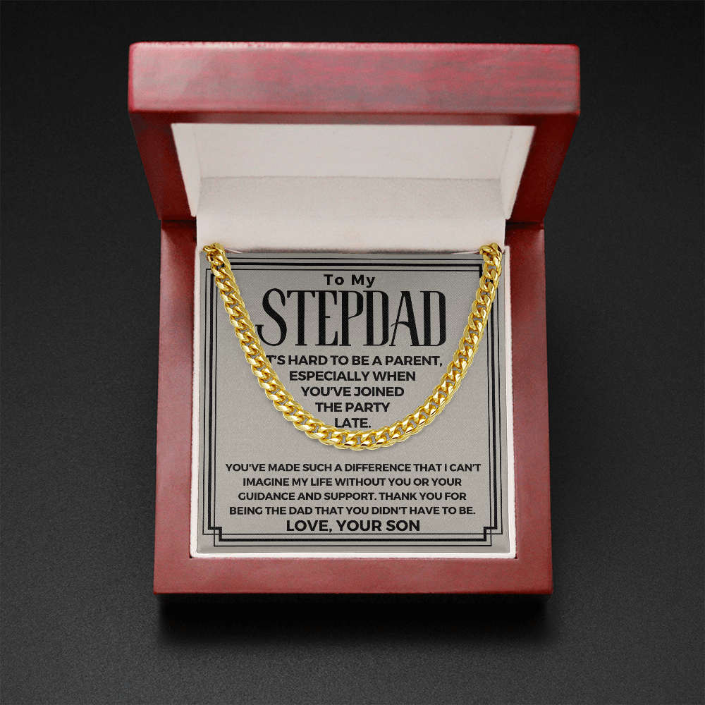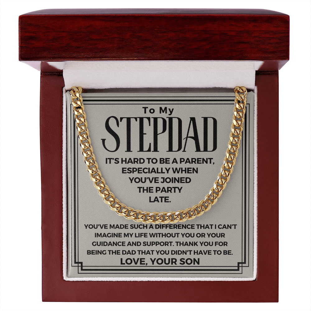 Surprise your stepdad with a timeless and stylish Cuban Link Chain necklace that he can wear with almost anything - a perfect gift for any occasion! Our Cuban link necklace is available in polished stainless steel and in a 14k over stainless steel finish. The yellow gold Cuban link necklace chain measures 18 inches and fastens with a parrot clasp to keep it secure. This beautiful necklace is also one of the best unique birthday gift ideas because it comes in a luxury wooden gift box that features a LED light with a sweet, heartfelt message that will surely make your stepdad feel loved and appreciated!