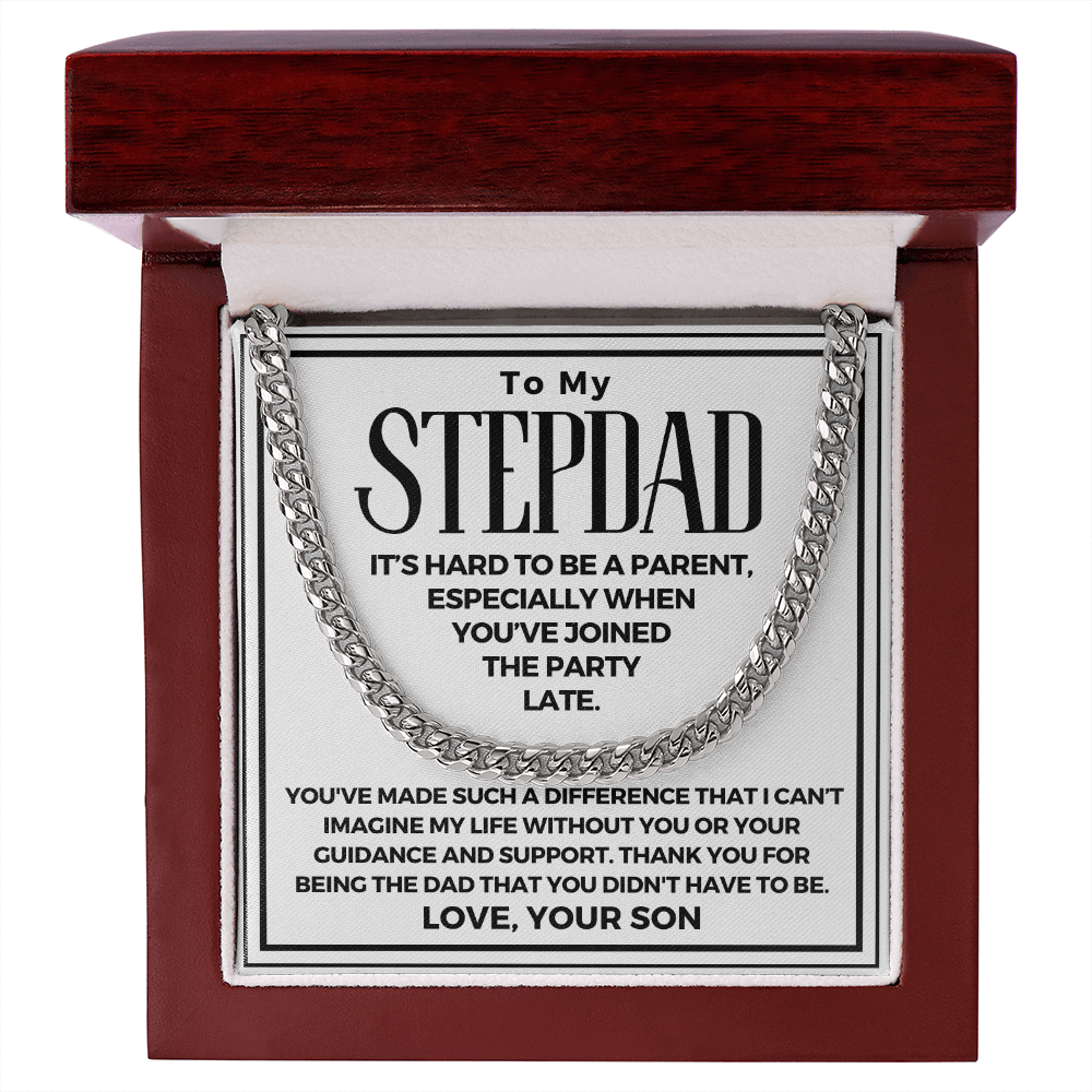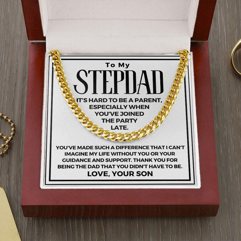 Surprise your stepdad with a timeless and stylish Cuban Link Chain necklace that he can wear with almost anything - a perfect gift for any occasion! Our Cuban link necklace is available in polished stainless steel and in a 14k over stainless steel finish. The yellow gold Cuban link necklace chain measures 18 inches and fastens with a parrot clasp to keep it secure. This beautiful necklace is also one of the best unique birthday gift ideas because it comes in a luxury wooden gift box that features a LED light with a sweet, heartfelt message that will surely make your stepdad feel loved and appreciated!