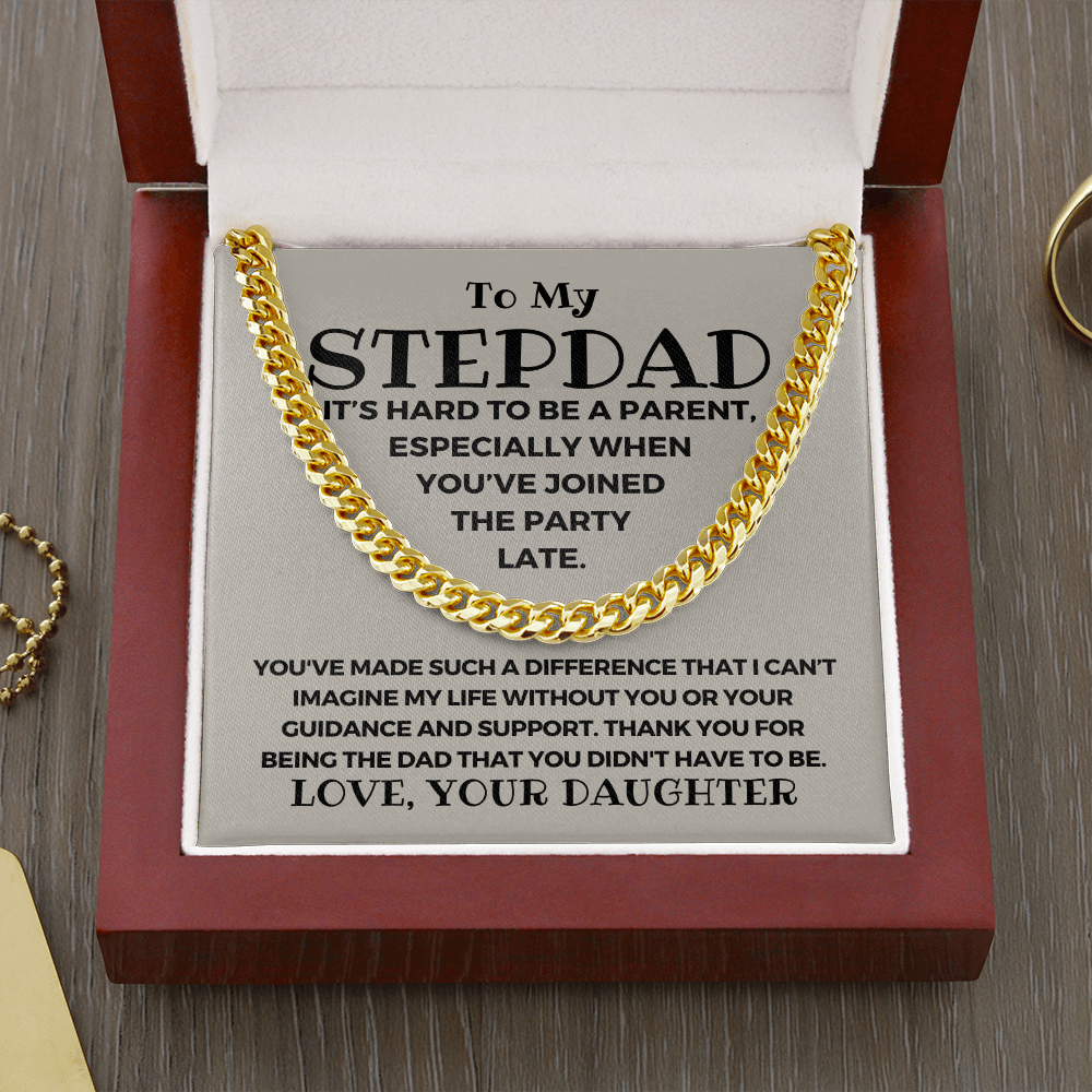 Surprise your stepdad with a timeless and stylish Cuban Link Chain necklace that he can wear with almost anything - a perfect gift for any occasion! Our Cuban link necklace is available in polished stainless steel and in a 14k over stainless steel finish. The yellow gold Cuban link necklace chain measures 18 inches and fastens with a parrot clasp to keep it secure. This beautiful necklace is also one of the best unique birthday gift ideas because it comes in a luxury wooden gift box that features a LED light with a sweet, heartfelt message that will surely make your stepdad feel loved and appreciated!