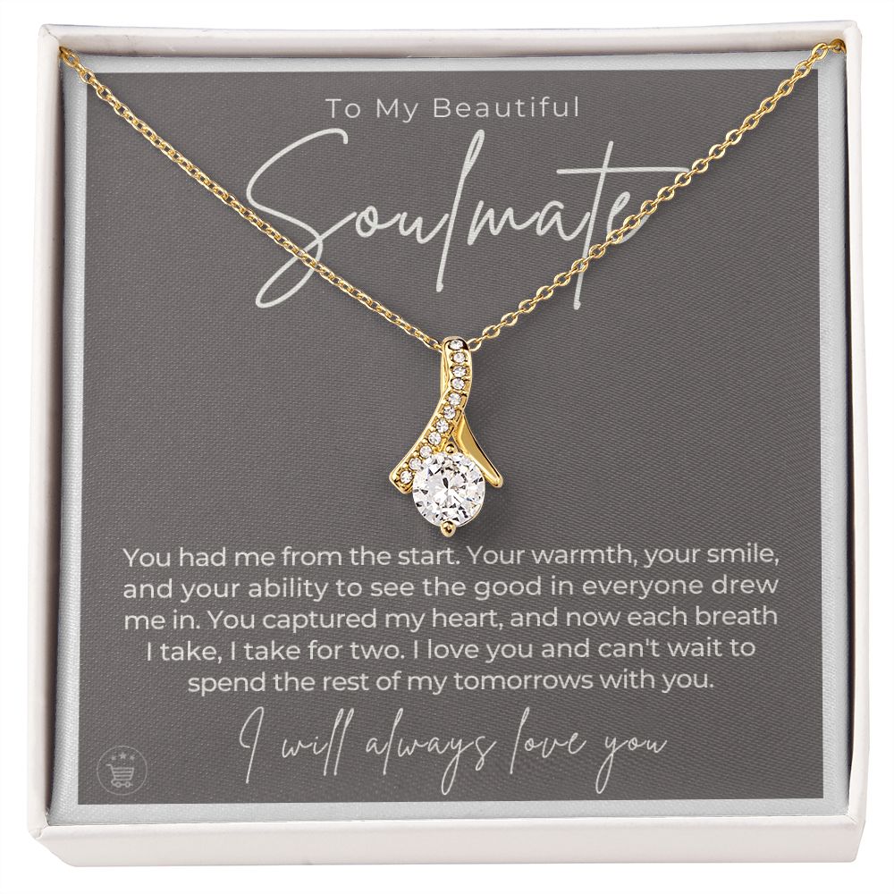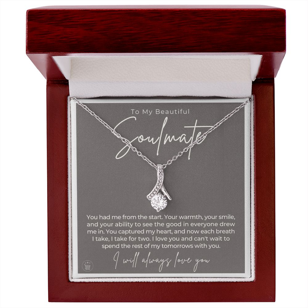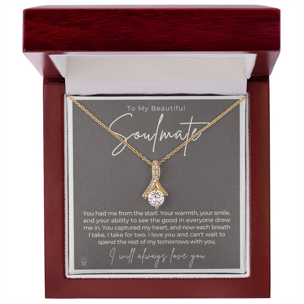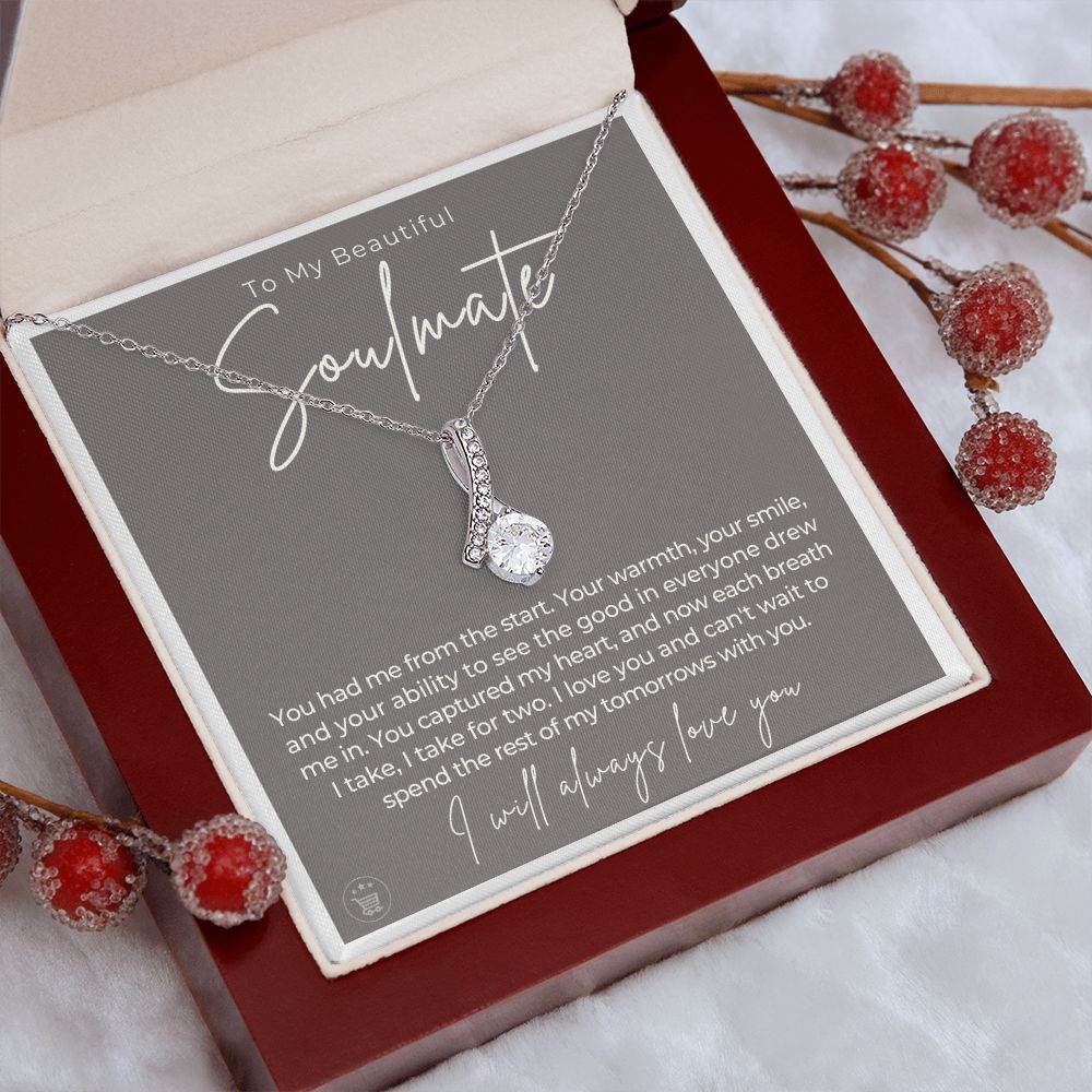 If you’re looking for a unique and special gift to give your soulmate on a special occasion, then look no further! This beautiful necklace is crafted with love and thoughtfulness. The pendant necklace comes in an elegant gift box with a sweet message that will surely make your soulmate feel loved and appreciated!